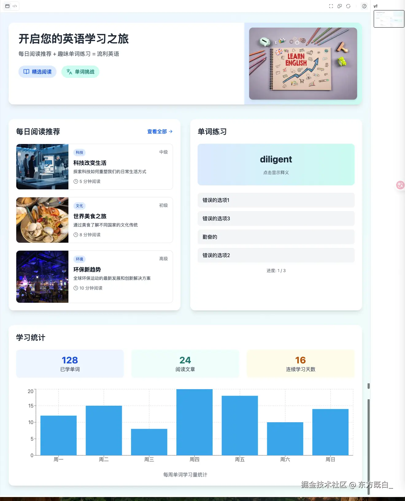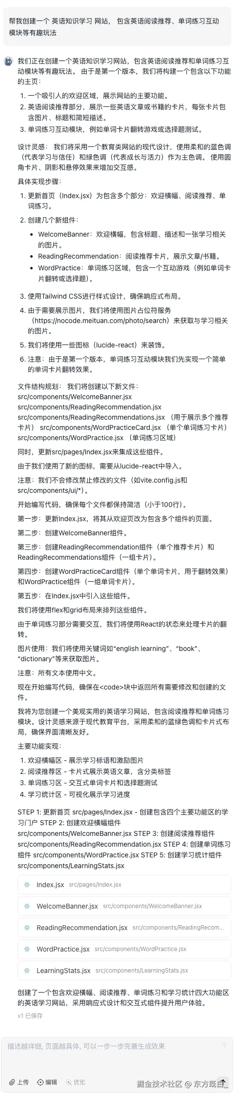 | Lovable | Lovable生成前,AI 会简单的梳理设计思路和功能。实际执行后,能够完整生成一个网页,包含主要的网页元素。功能上包含阅读推荐、单词练习、学习进度、徽章成就等主要功能,复合需求描述; | ⭐️⭐️⭐️⭐️ | ⭐️⭐️⭐️⭐️ | ⭐️⭐️⭐️⭐️ | ||