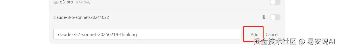 输入模型名称:claude-3-7-sonnet-20250219-thinking,点击Add