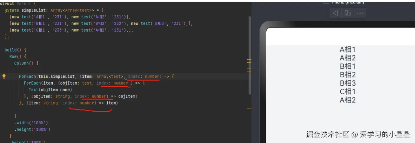 ForEach(this.simpleList, (item: Array<test>,index:number)=>{ ForEach(item,(objItem: test, index: number) => { Text(objItem.name)