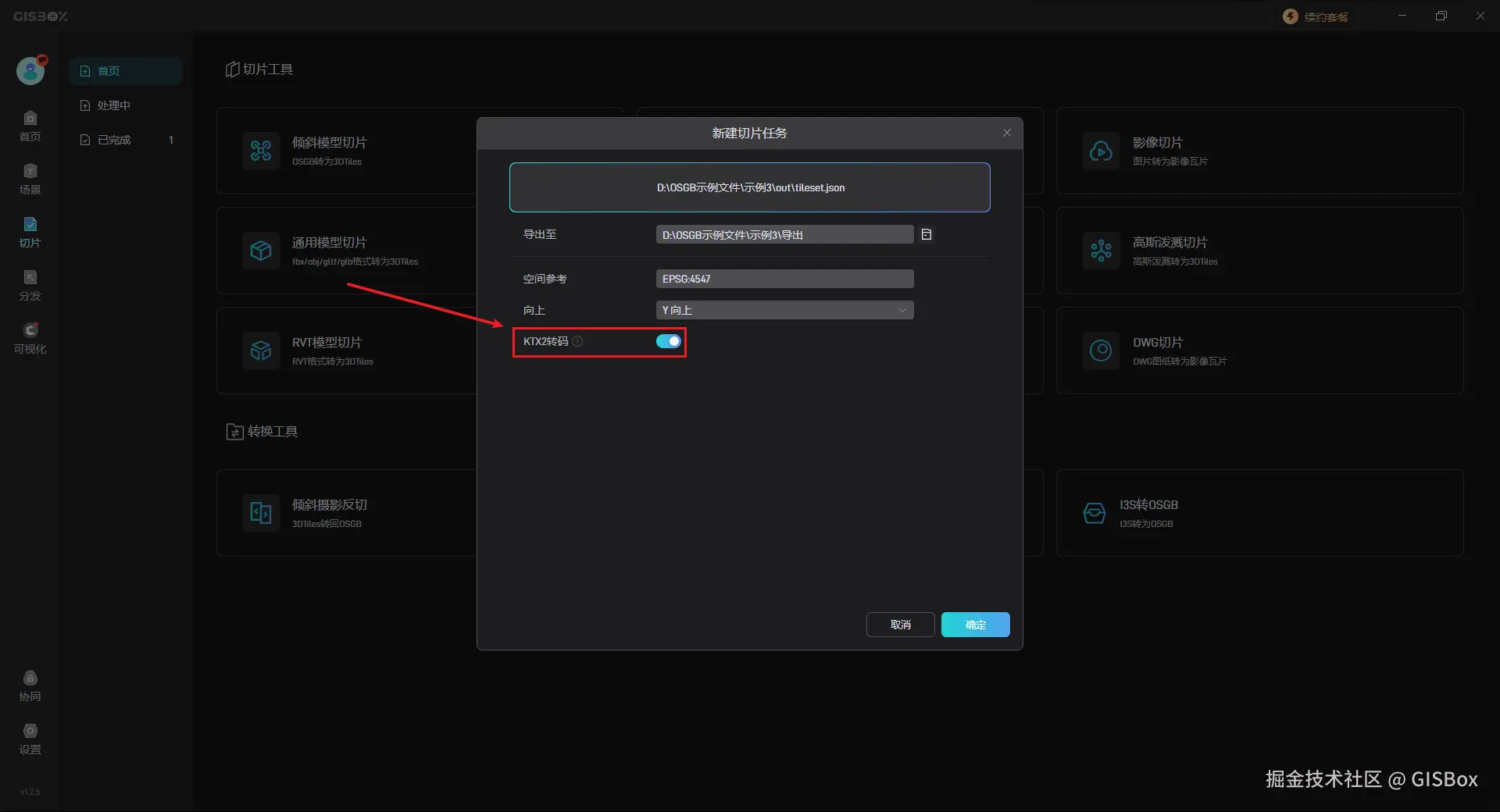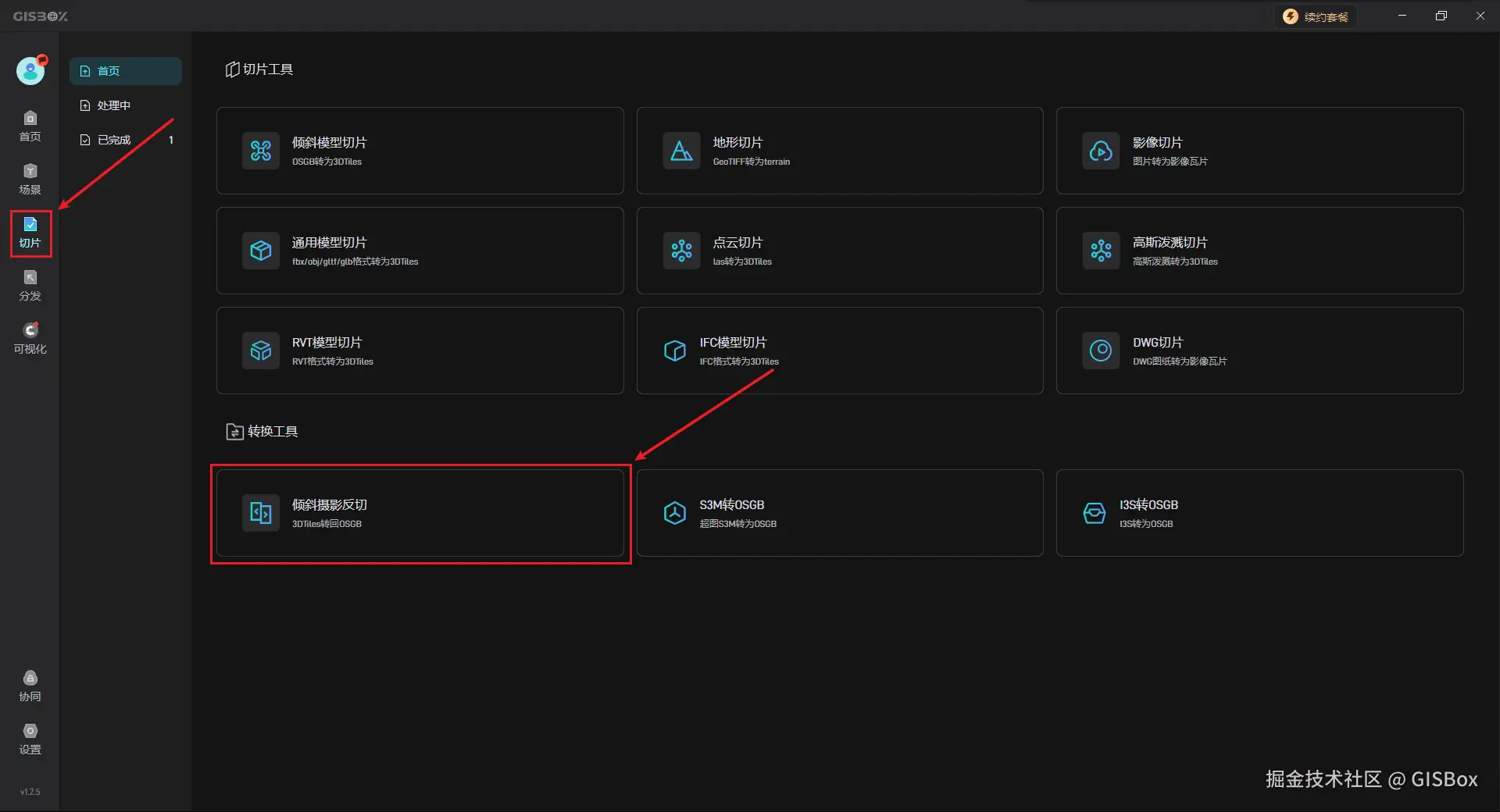 首先打开 “GISBox” 软件,点击切换左侧的 “切片” 模块,然后点击 “倾斜摄影反切” 创建一个切片任务。