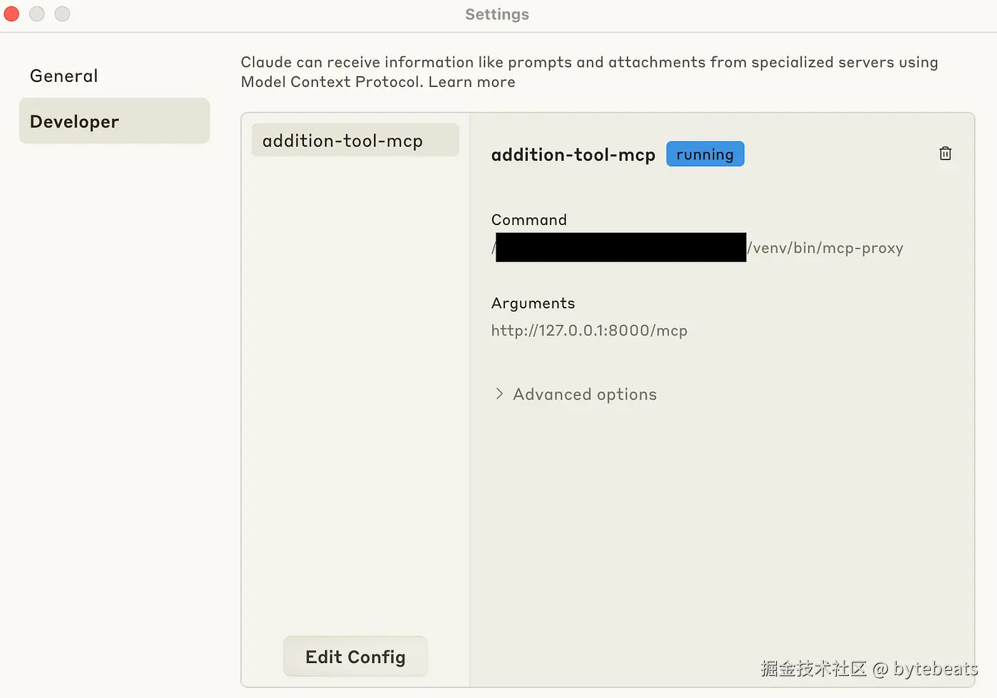 4. 重新启动 Claude 桌面代理: 关闭并重新打开 Claude 桌面代理应用程序. 你应该能够在以下位置看到正在运行的 MCP 服务器: Claude 设置 > 开发者