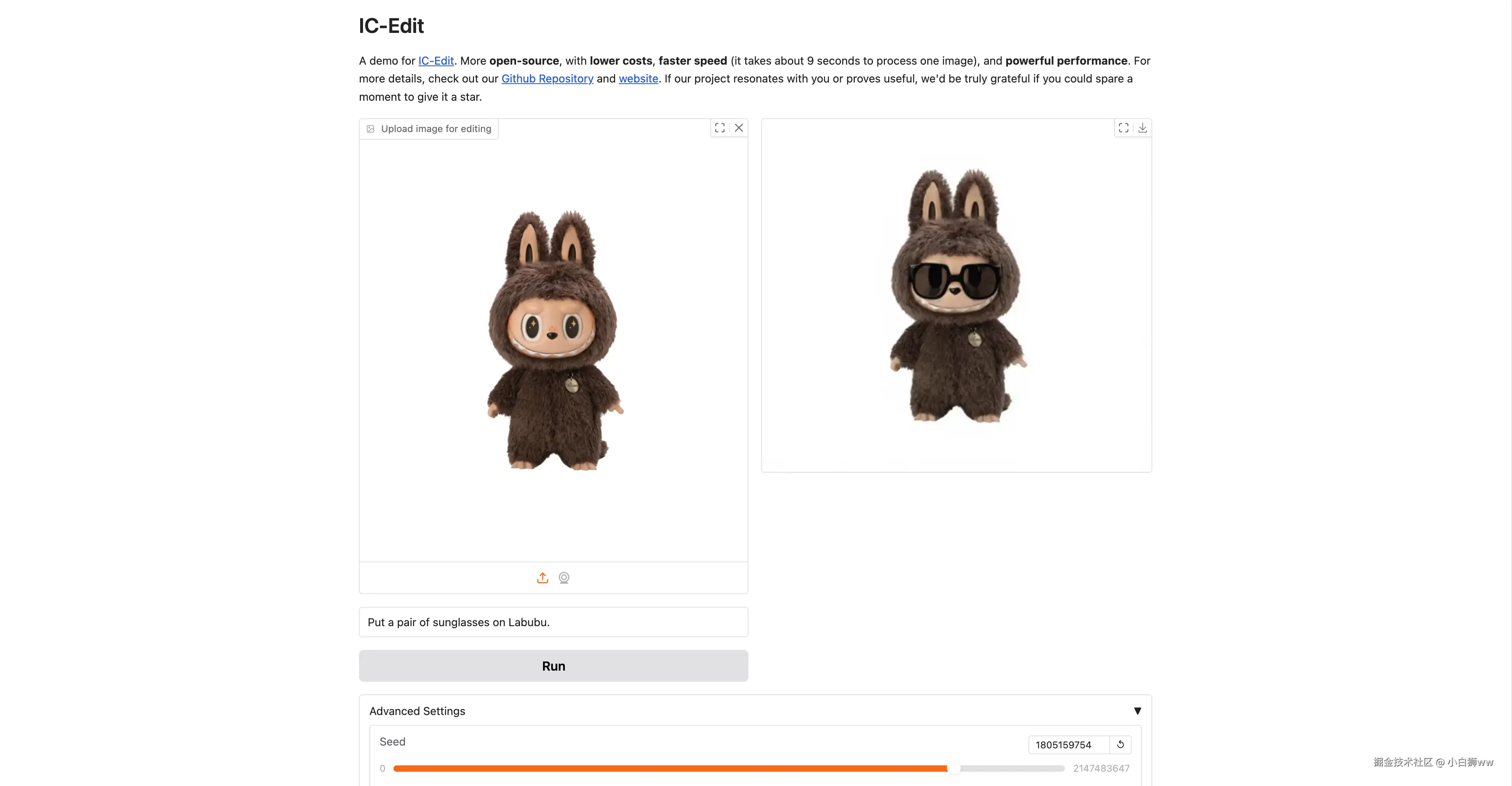 上传一张 Labubu 首领 Zimomo 的图片,输入 prompt 「put a pair of sunglasses on Labubu」后点击「Run」,可以看到它快速生成了一张带着墨镜的 Labubu。