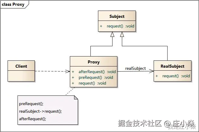 - 编写代理类(Proxy),内部持有 RealSubject 对象,控制访问