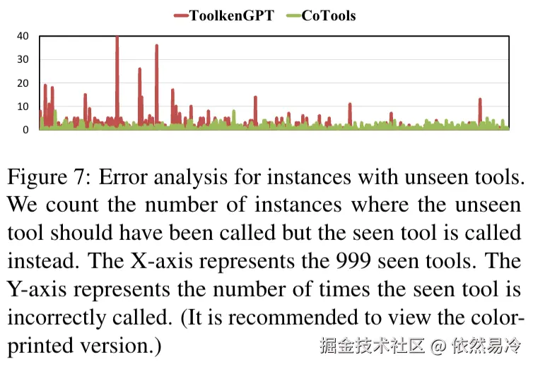 ⑦【图7】在未见工具场景中,ToolkenGPT存在显著偏向调用已见工具的问题,而CoTools能更有效区分已见与未见工具,减少对已见工具的错误调用。