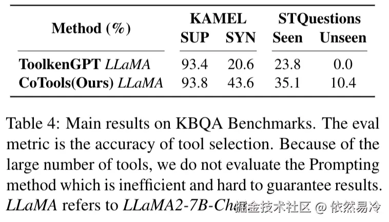 ③【表4】在KBQA任务中,CoTools在KAMEL(含高质量和低质量训练数据)及STQuestions(含大量可见和未见工具)场景下的工具选择准确性均优于ToolkenGPT,尤其在低质量数据和未见工具场景优势显著。
