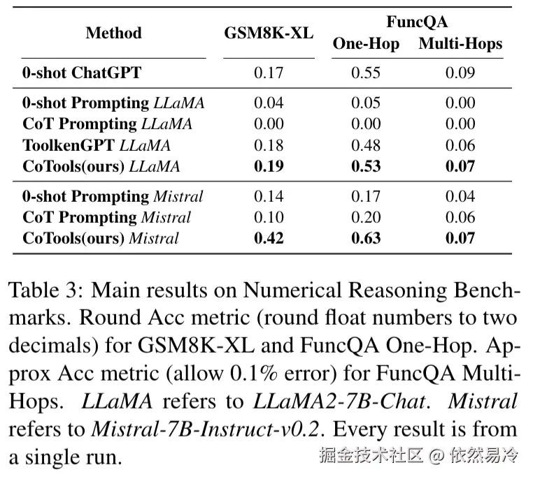 ②【表3】在数值推理任务中,CoTools在GSM8K-XL和FuncQA数据集上的表现优于0-shot Prompting、CoT Prompting等基线方法,且相比ToolkenGPT在部分场景更具优势,其性能依赖基础模型能力且能增强模型表现。