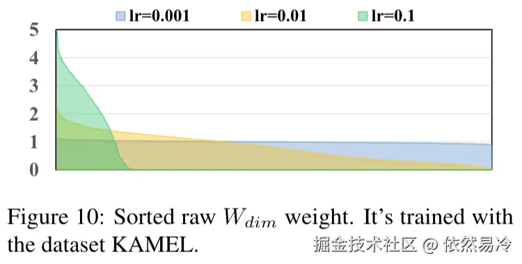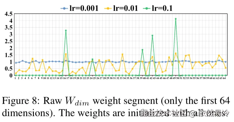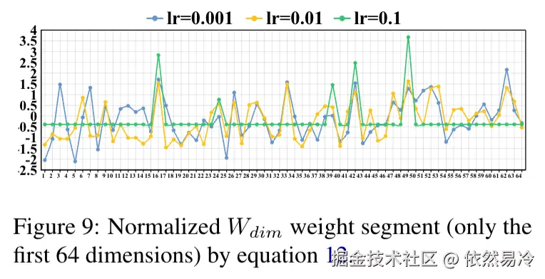 ⑨【图9】归一化后,不同学习率下的 W_dim权重呈现相似趋势,共享参数中数值较高的维度对工具选择起关键作用。