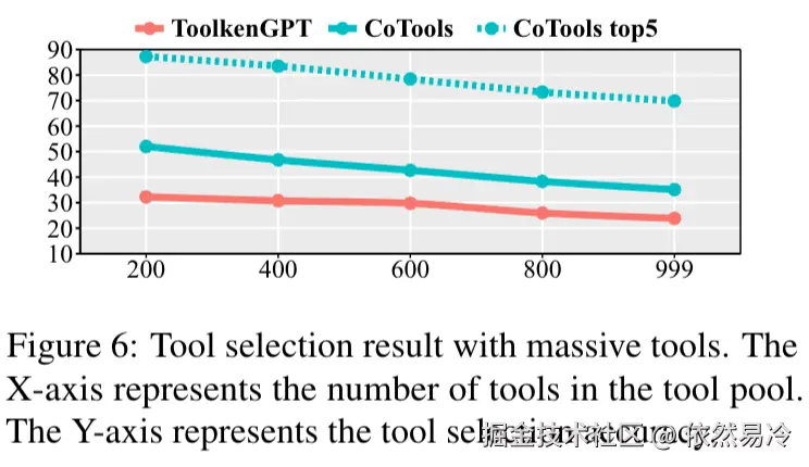 ⑥【图6】在工具规模达千级的STQuestions基准测试中,CoTools的工具选择准确率显著高于ToolkenGPT,且随着工具数量增加,其凭借大语言模型的强语言理解能力在相似工具场景中优势更明显。