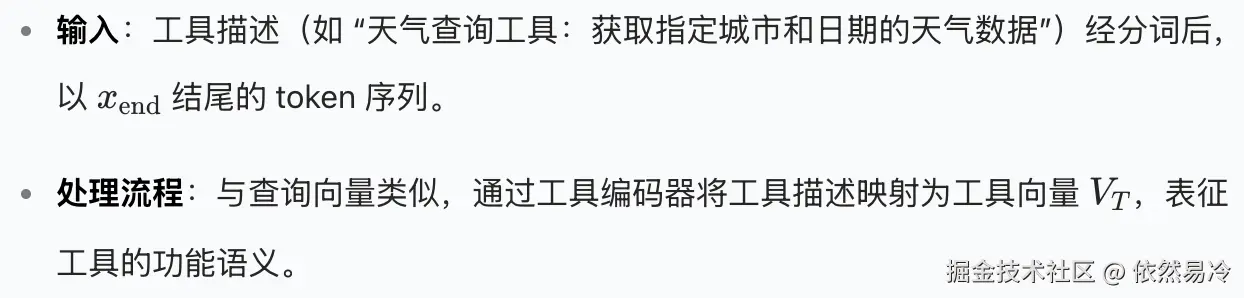 - 输入:已检索到的目标工具(如 “天气查询工具”)和当前推理中的问题、答案片段。