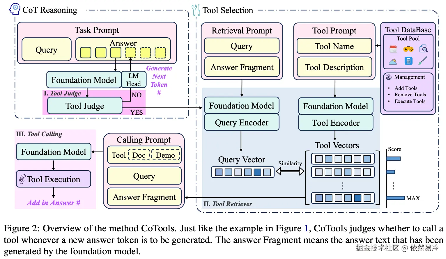- 工具提示(Tool Prompt) :包含工具名称(Tool Name)和工具描述(Tool Description),通过工具编码器(Tool Encoder)得到工具向量(Tool Vectors) 。然后计算查询向量和工具向量之间的相似度(Similarity),依据相似度给各个工具打分(Score),选出得分最高(MAX)的工具 。工具相关信息都存储在工具数据库(Tool DataBase)中,这里面有工具池(Tool Pool ),还能进行工具管理(如添加工具、移除工具、执行工具等操作 )。