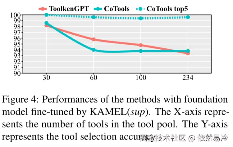 ④【图4】在使用高质量人工标注的KAMEL(sup)数据集微调基础模型时,CoTools和ToolkenGPT在工具选择准确性上表现均较好,且CoTools的前5选择准确性接近100%,在真实场景中表现稳定。