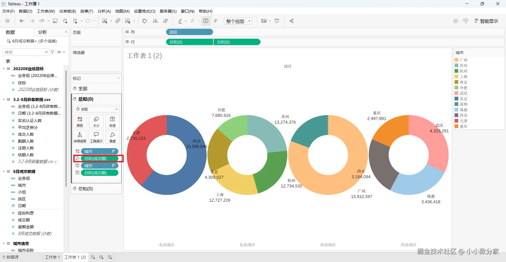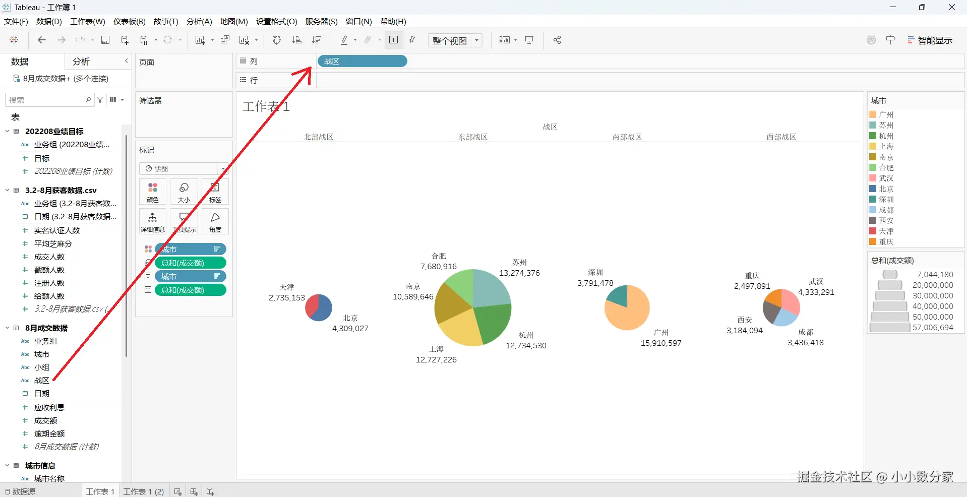 1,将战区拖入到列,但是会发现这里环形图大小不一致(这是因为我们的饼图现在的大小是由我们的成交额决定的,但是由于大小发生了变化,我们将里面白色的环调小一点,我们会发现每个城市成交额不同,所以它的大小也是不同的)
