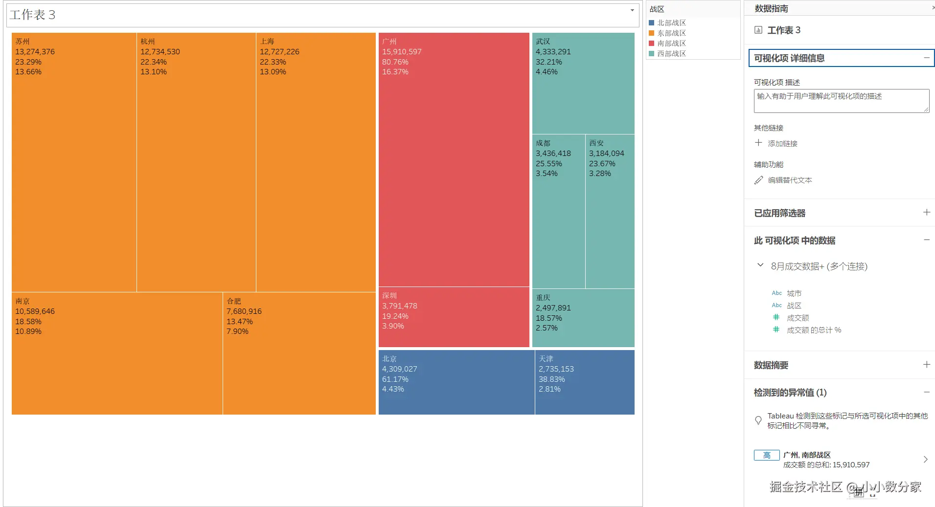 2.将战区拖入到颜色,成交额拖入到大小
