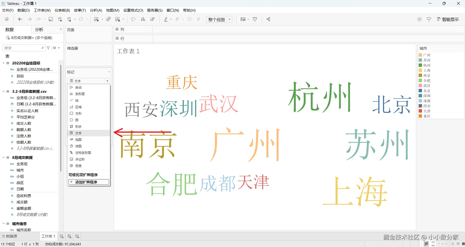 1.将城市拖到颜色,成交额拖到大小