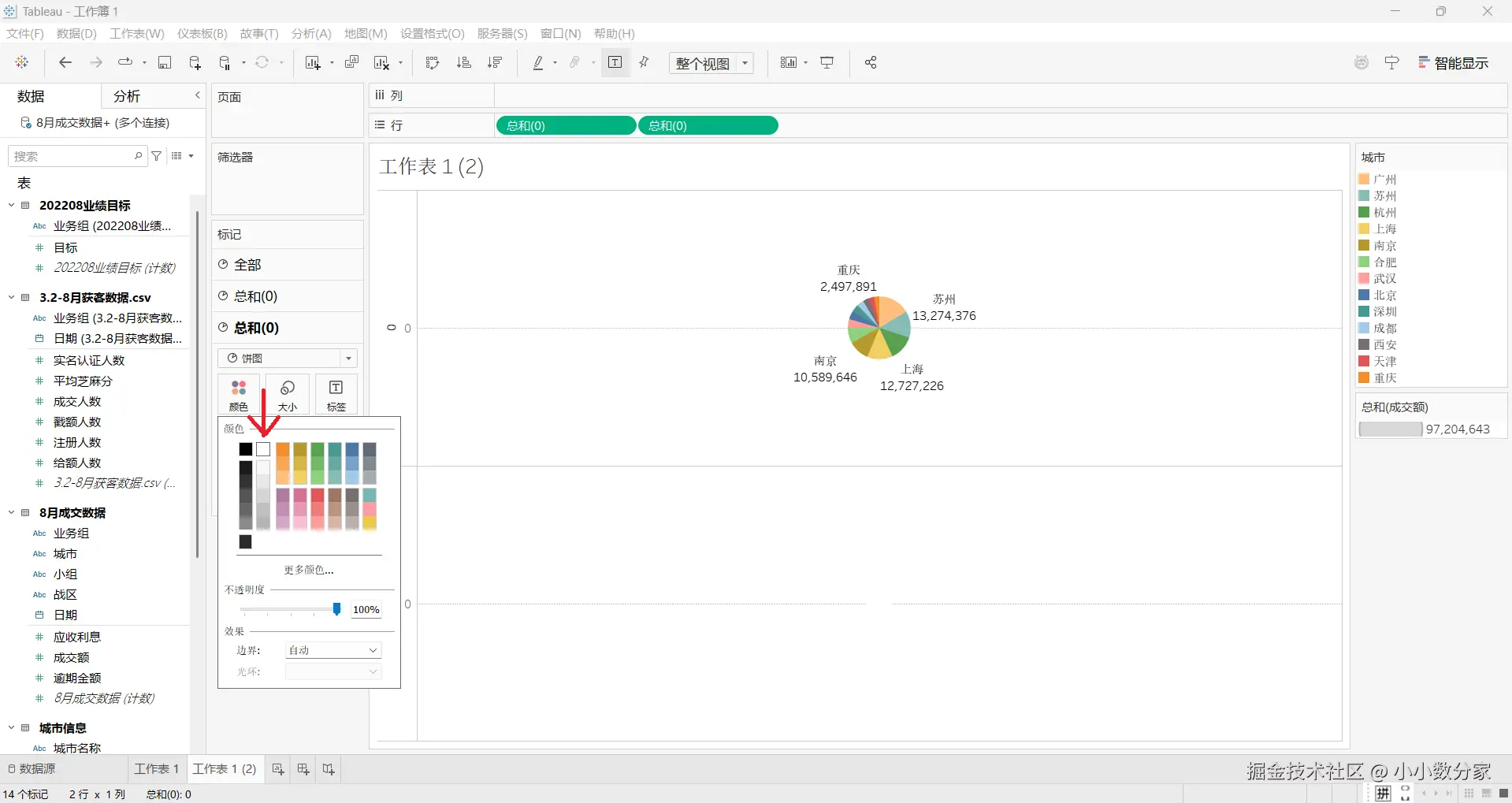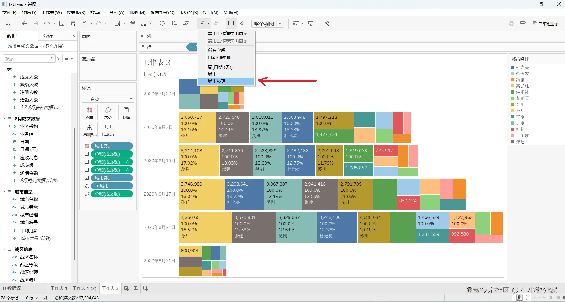 2.首先可以把战区,城市给去掉(让它直接基于城市进行切分),然后将城市经理拖拽到标签和颜色上