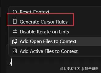 .cursor/rules目录下。在一个项目完成后,还可以用/generate rules命令让AI自动为当前项目生成规则,方便下次复用。 -