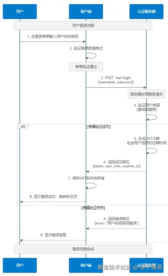 在编写登录流程的代码之前,请先为我生成一个Mermaid序列图(sequence diagram) ,清晰地展示以下流程: