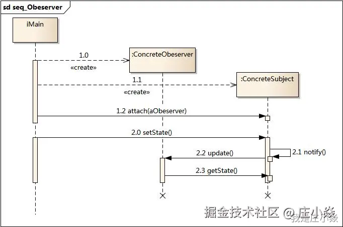 - 维护观察者列表,实现注册、移除、通知逻辑。