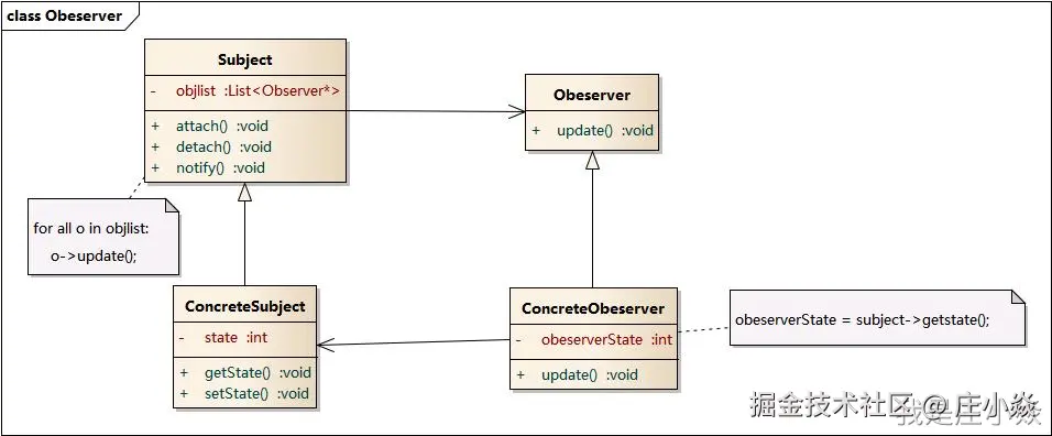 - 被观察者(Subject) :维护一组观察者,负责状态的管理和通知。