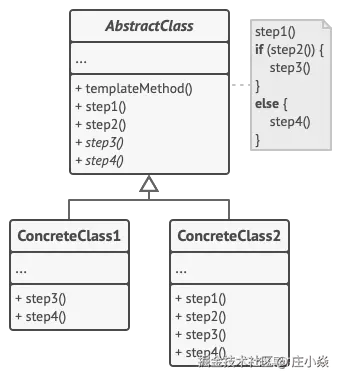 抽象类型, 也可以提供一些默认实现。 - 具体类 (ConcreteClass) 可以重写所有步骤, 但不能重写模板方法自身。