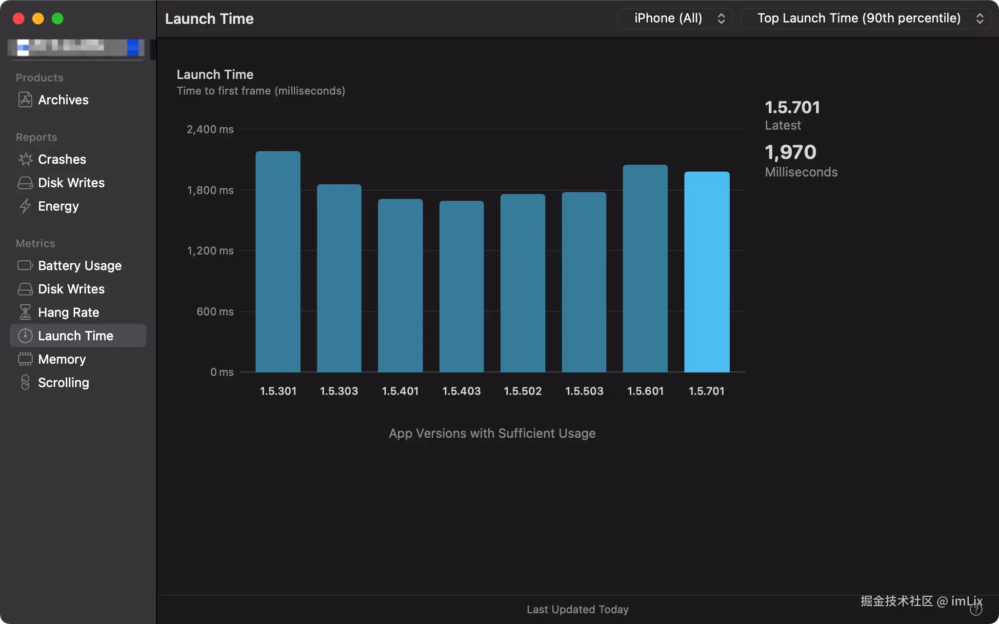 iOS 13 开始,Apple 提供了 MetricKit 用于统计 APP 的性能数据,包括 APP 启动时间、电池使用、磁盘 IO 等性能数据,iOS 系统会自动收集收集这些性能数据进行上报,在 Xcode 11 版本我们可以在 Window - Organizer 中看到 APP 的这些数据: