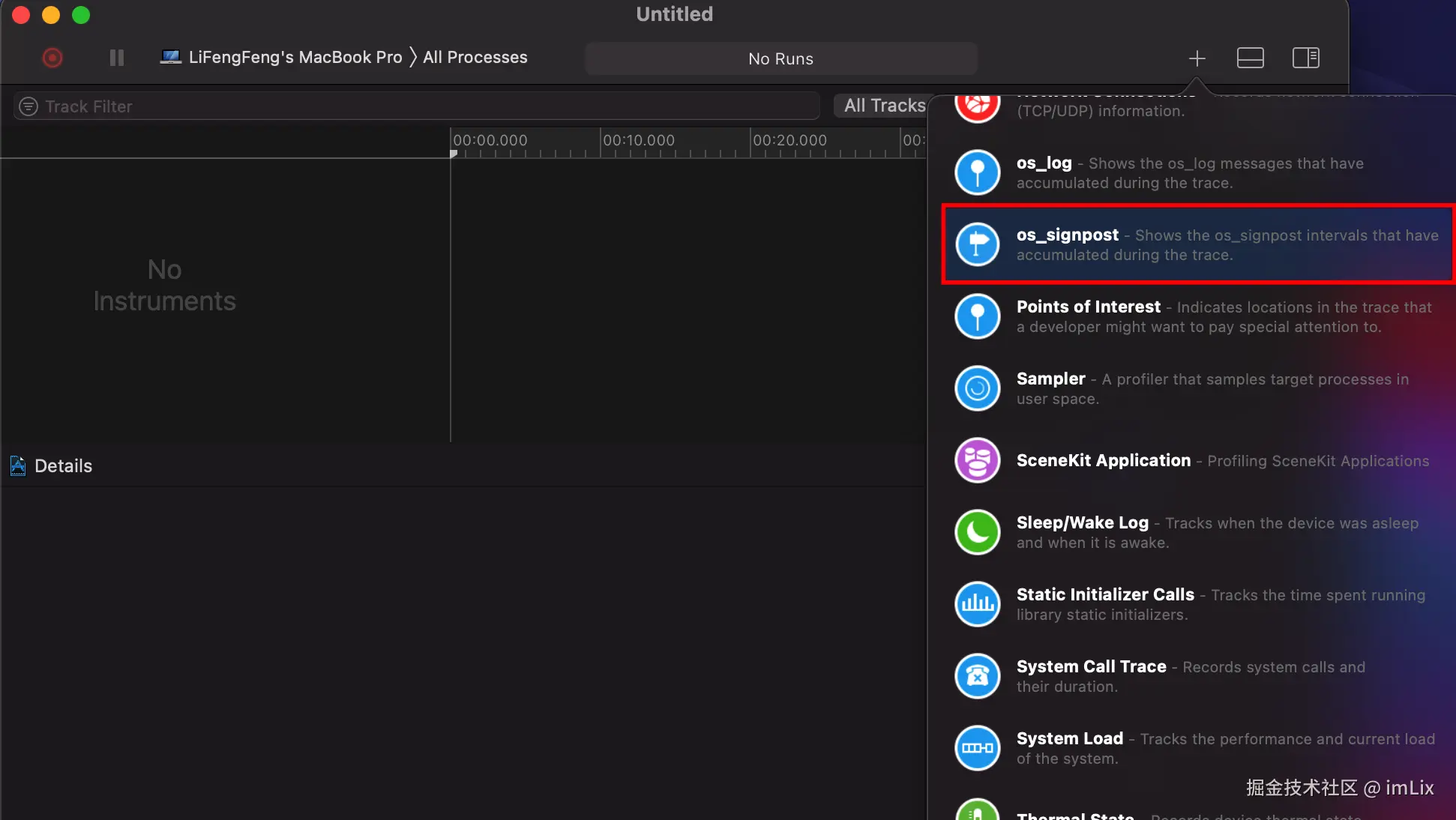 App Launch 是 Xcode 11 后新出的模板,同时包含了 Time Profile 以及 System Trace 的功能,可以用于查看 App 的启动过程,从而可以针对性的对启动速度进行优化,使用方式如下: