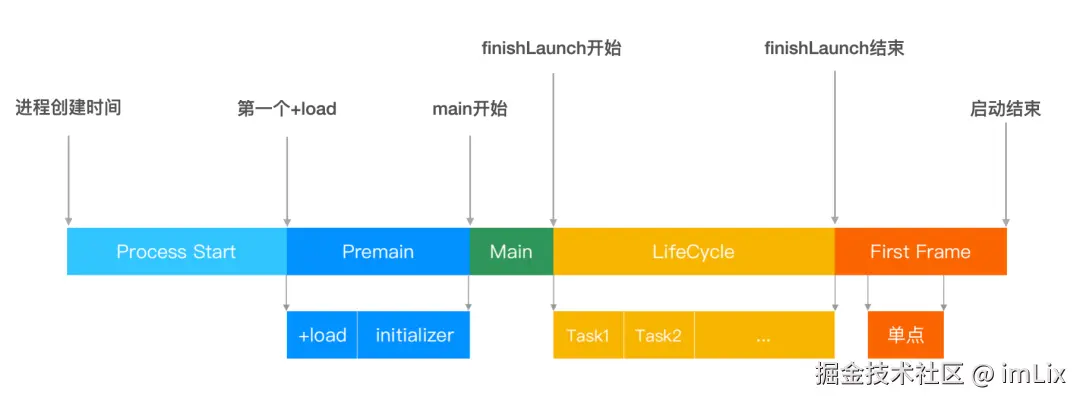 无侵入监控的好处是降低使用者的学习成本,无需更改 APP 的现有逻辑。无侵入埋点对冷启动的定义仍然可以是“进程创建”到“首屏渲染完成”这段时间,这里可以参考字节的 APM 团队提供的一种无侵入的启动监控方案,方案将启动流程拆分成几个粒度比较粗的与业务无关的阶段:进程创建,最早的 +load,didFinishLuanching 开始和首屏首次绘制完成。