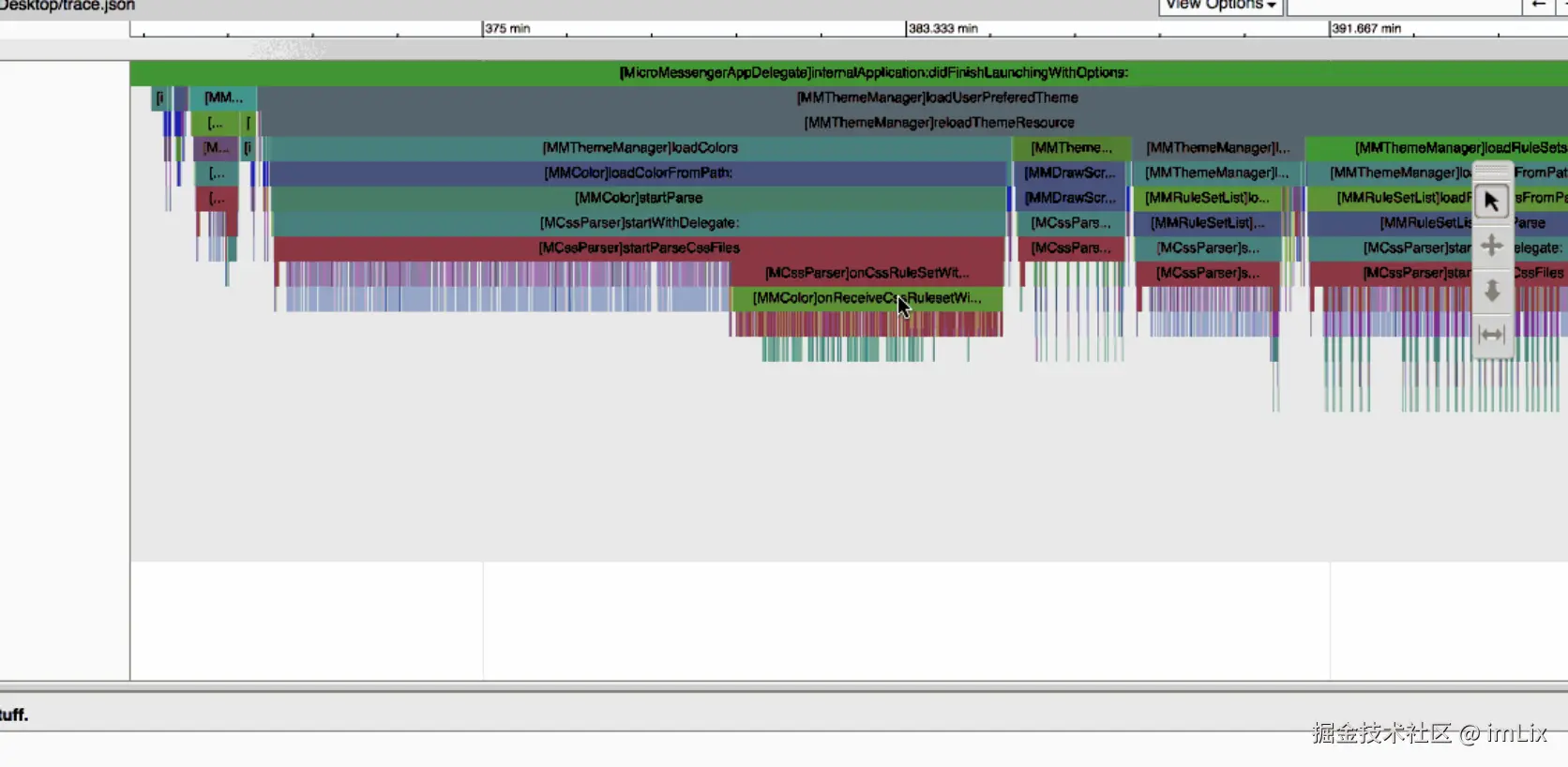 之后就可以查看主线程被阻塞的情况,再借助 Time Profile 查看调用堆栈定位耗时任务进行优化即可。