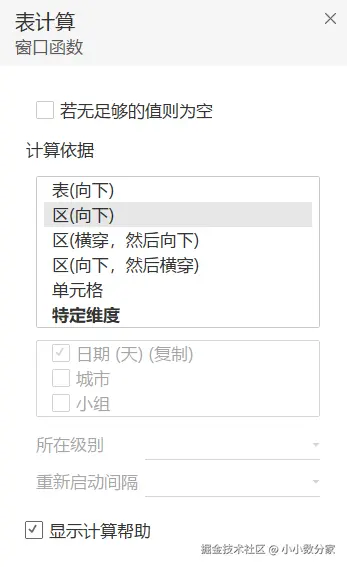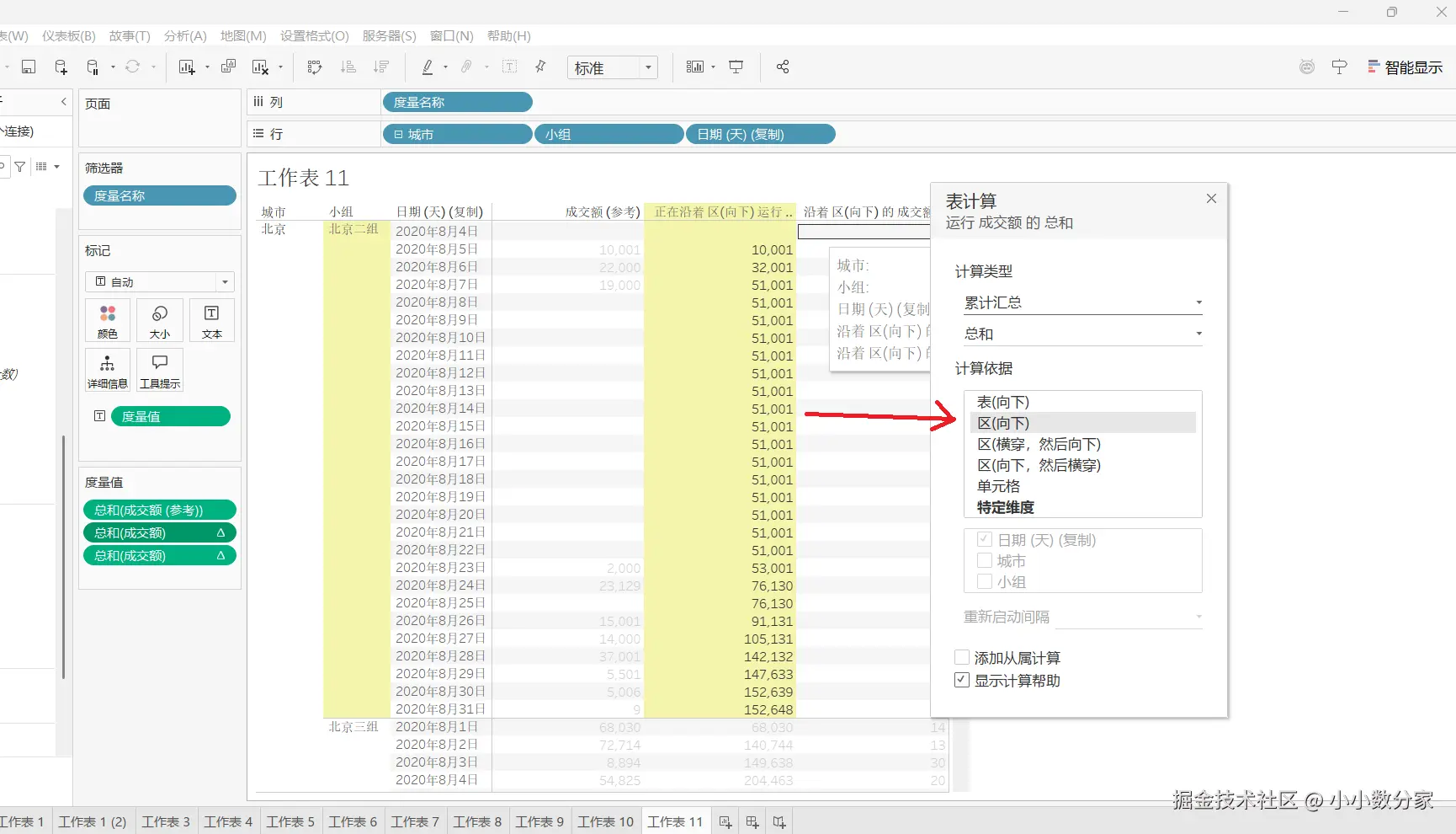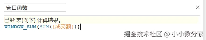 2.比如说我们改为WINDOW_SUM(SUM([成交额])),右键编辑表计算,选择区(向下),这里的区(向下)就是每个小组在它当前的区域里面它的一个成交额总和。我们来验证一下,比如我们可以在分析-->里将合计拖拽到小计里,发现成交额的小计和窗口函数算出来的整个窗口的总和计算结果是一样的