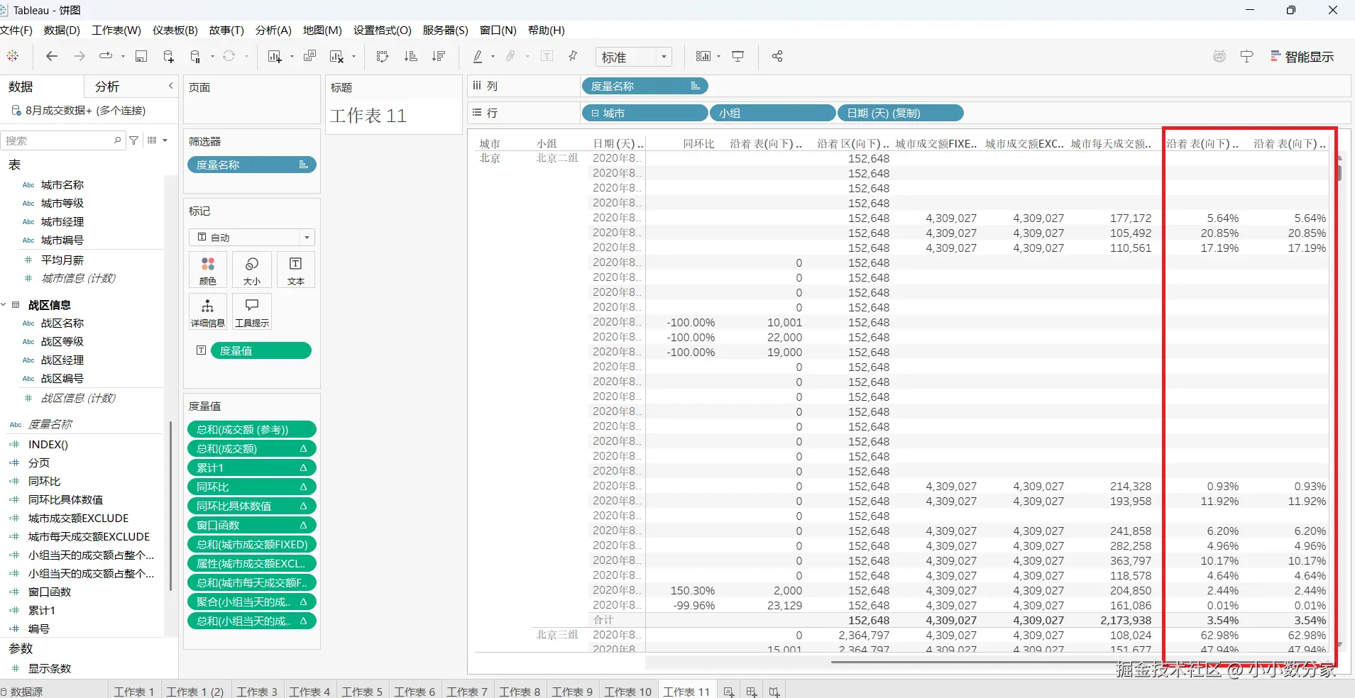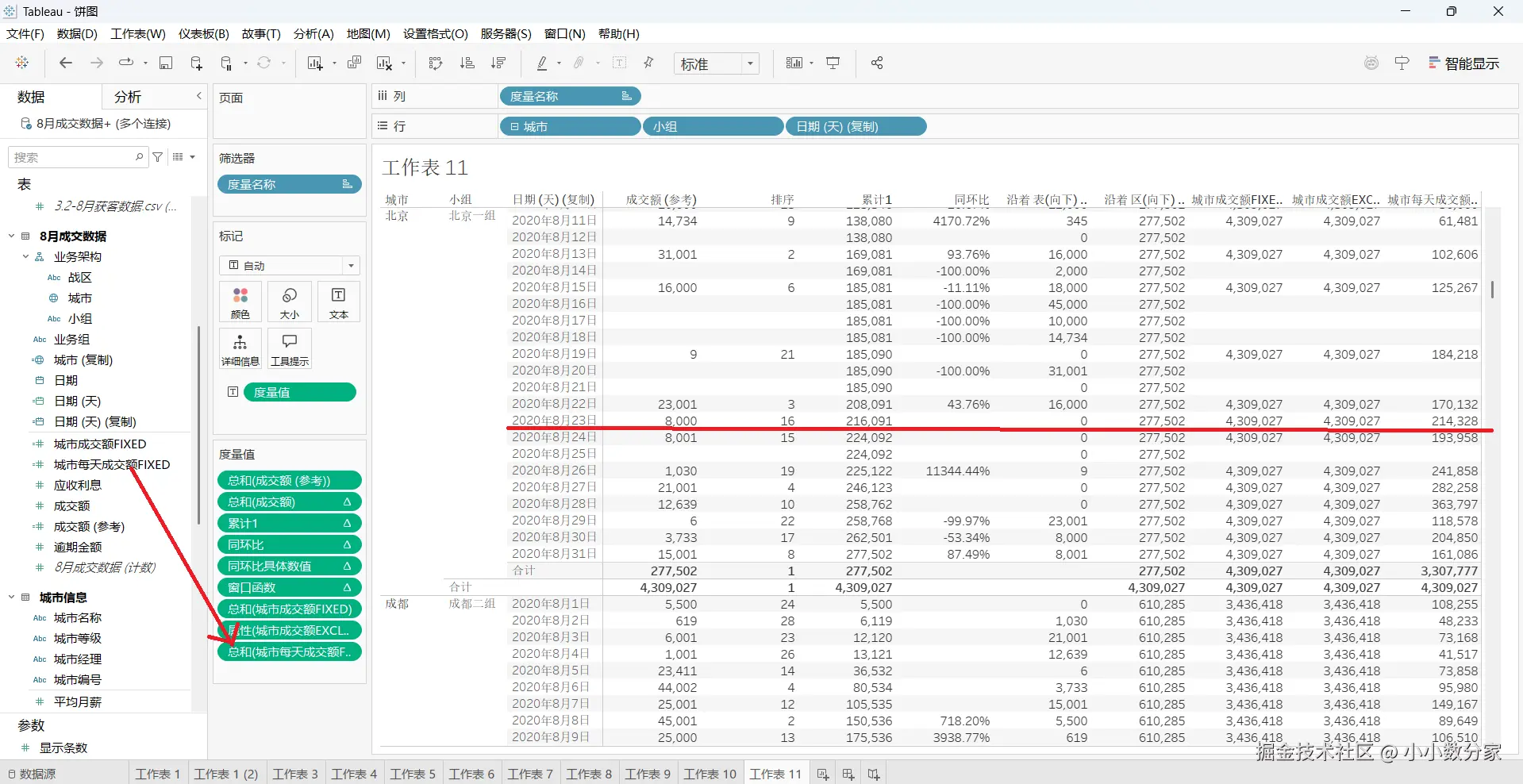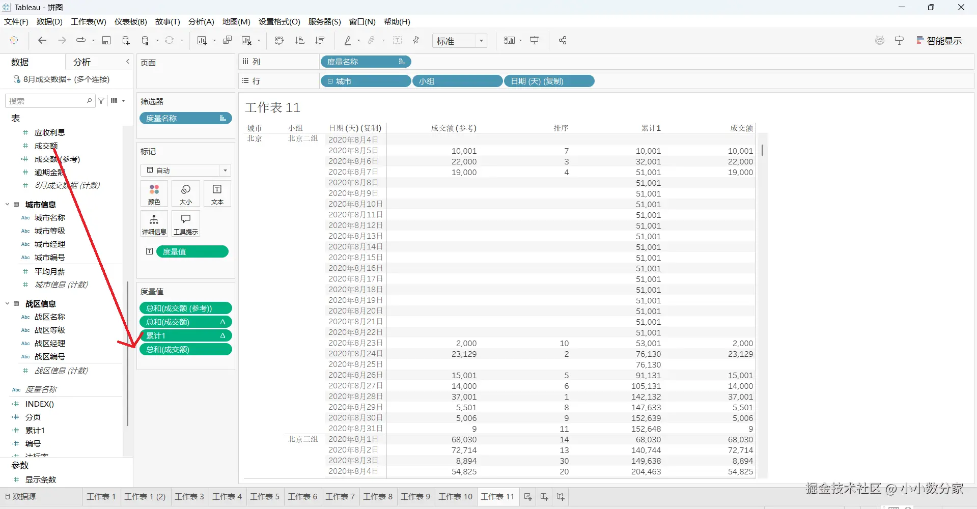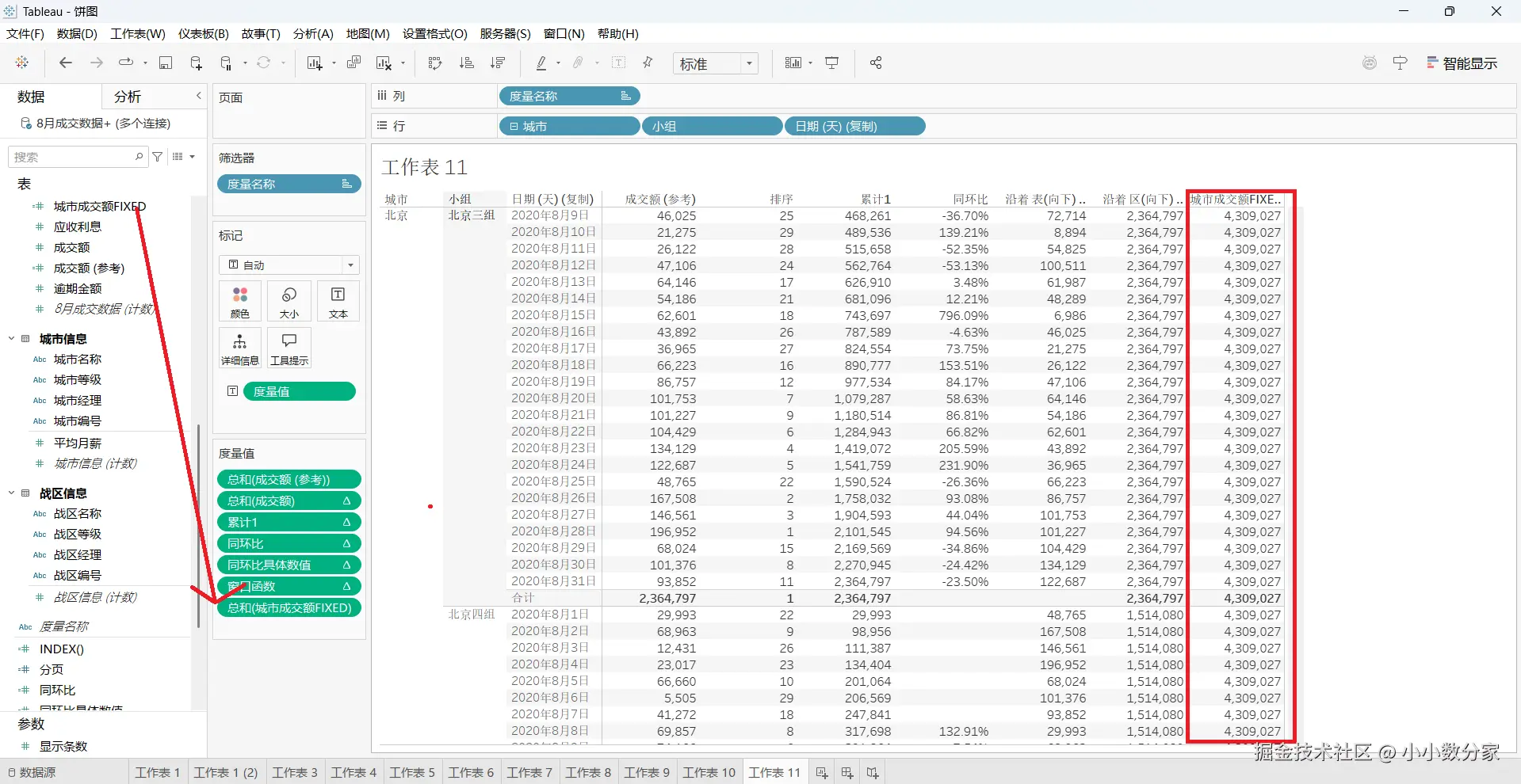 3.创建计算字段,命名为城市每日成交额FIXED,输入我们的LOD表达式,将做好的字段拖拽到度量,比如说北京8月23日成交额位214328
