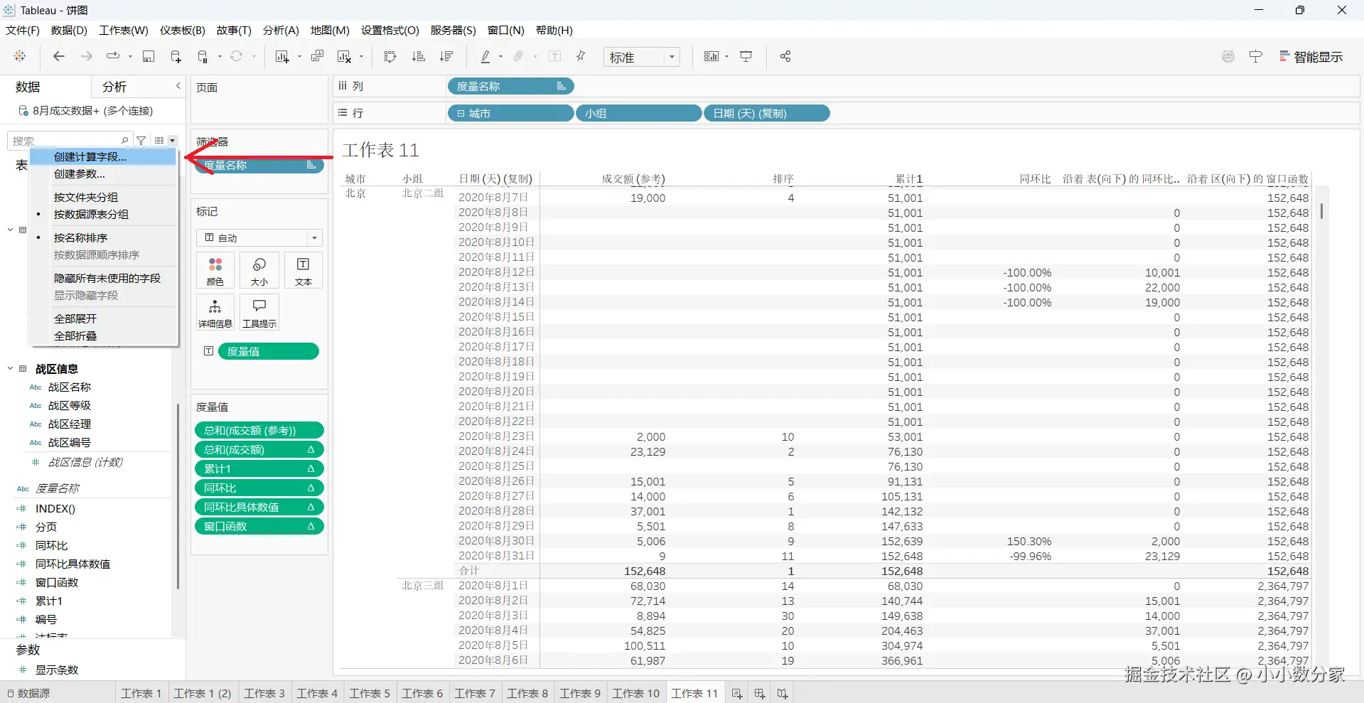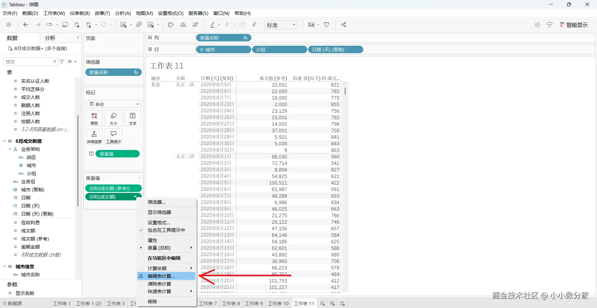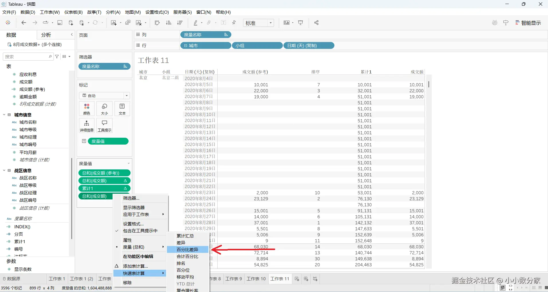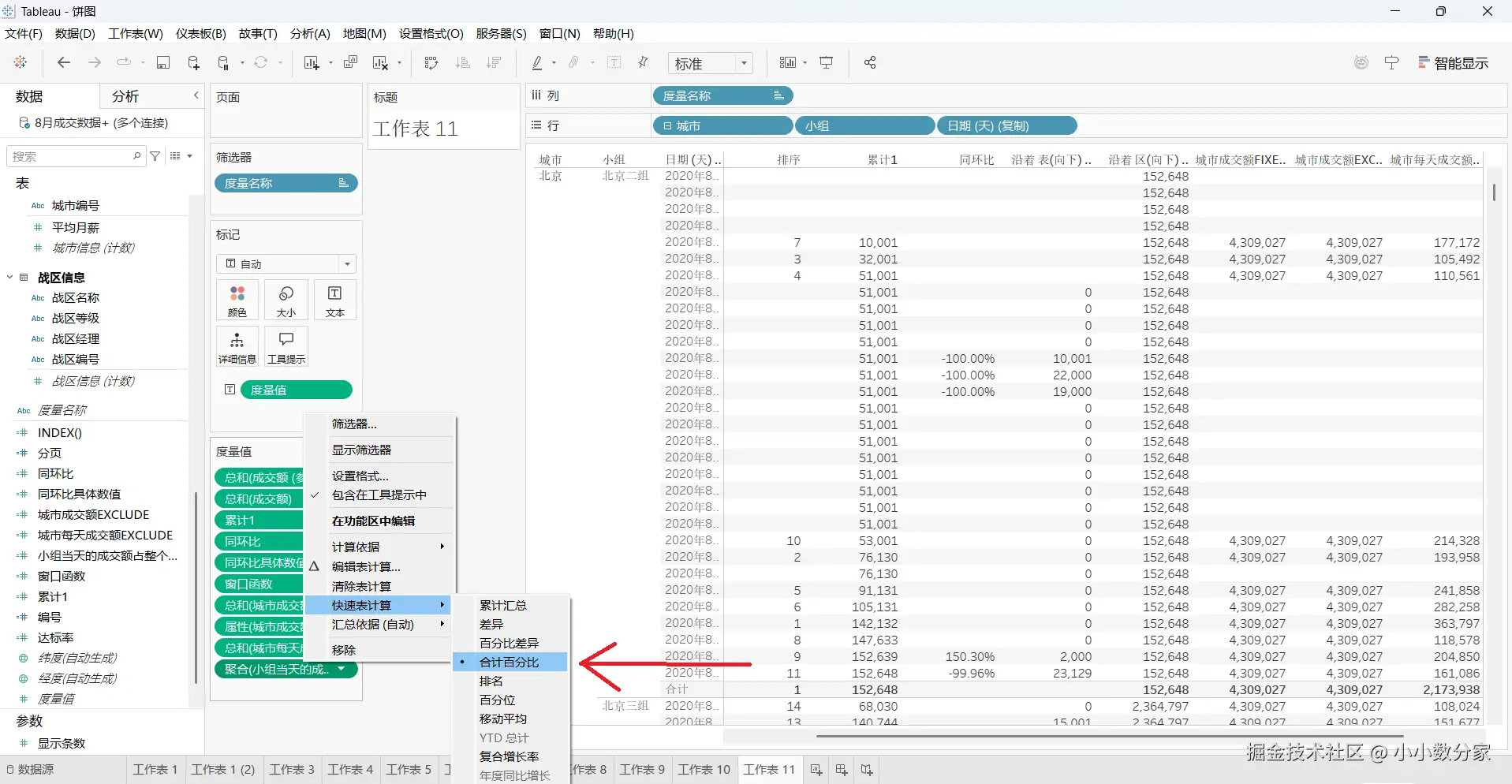 创建计算字段,命名为小组当天的成交额占整个城市成交额的占比,移动到度量值,点击快速表计算-->合计百分比