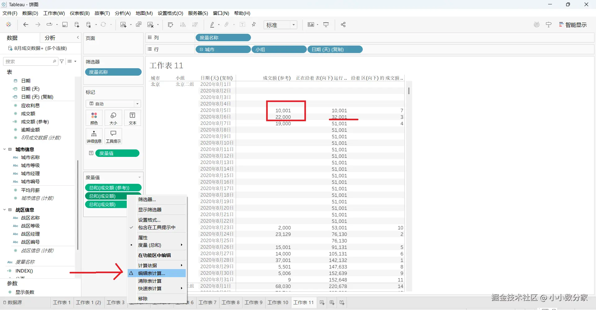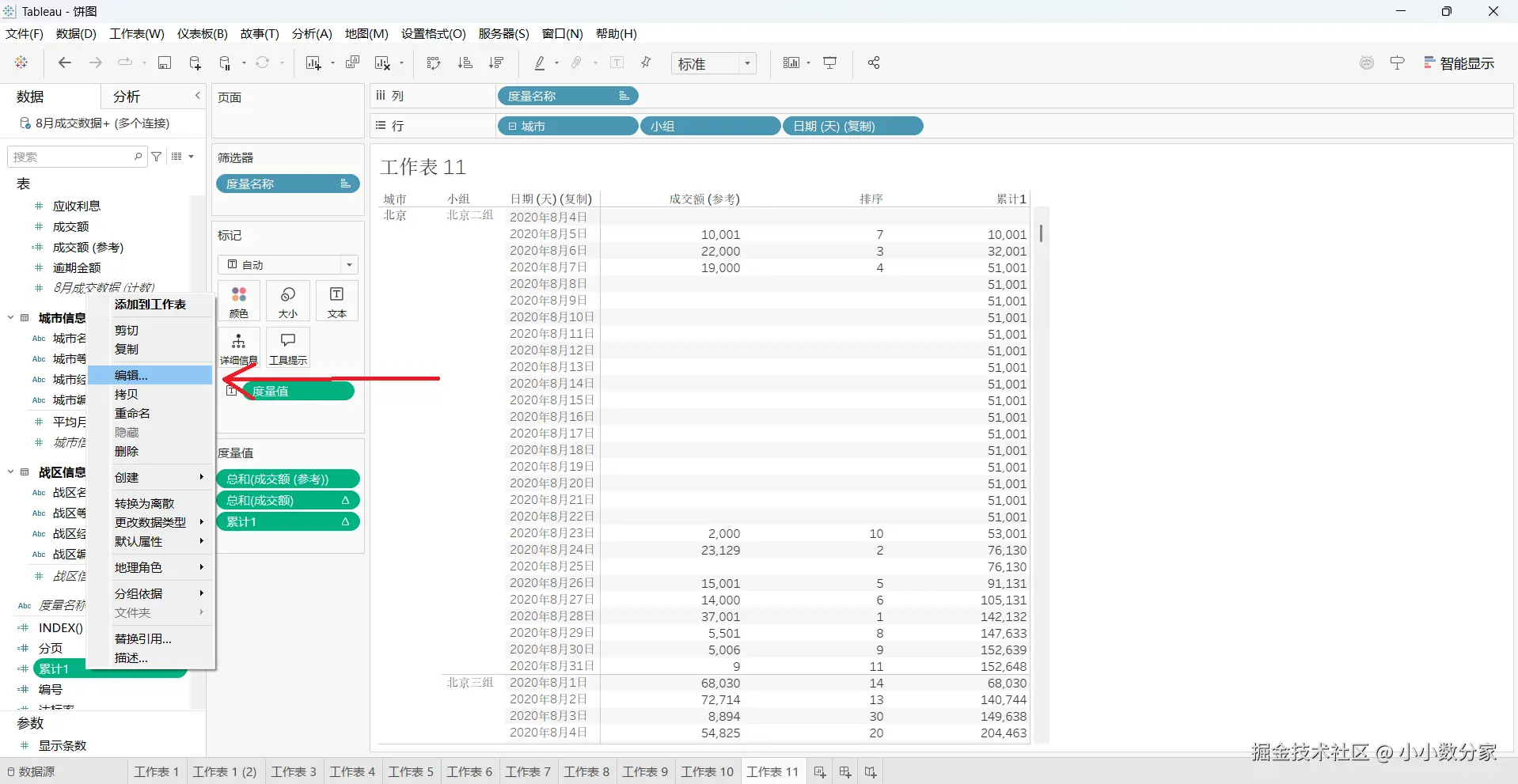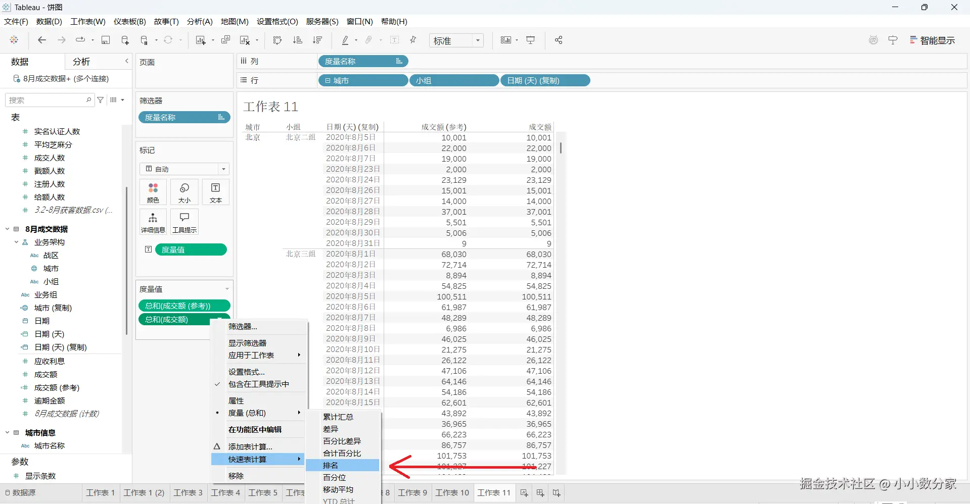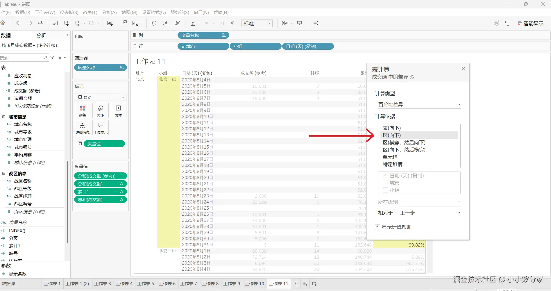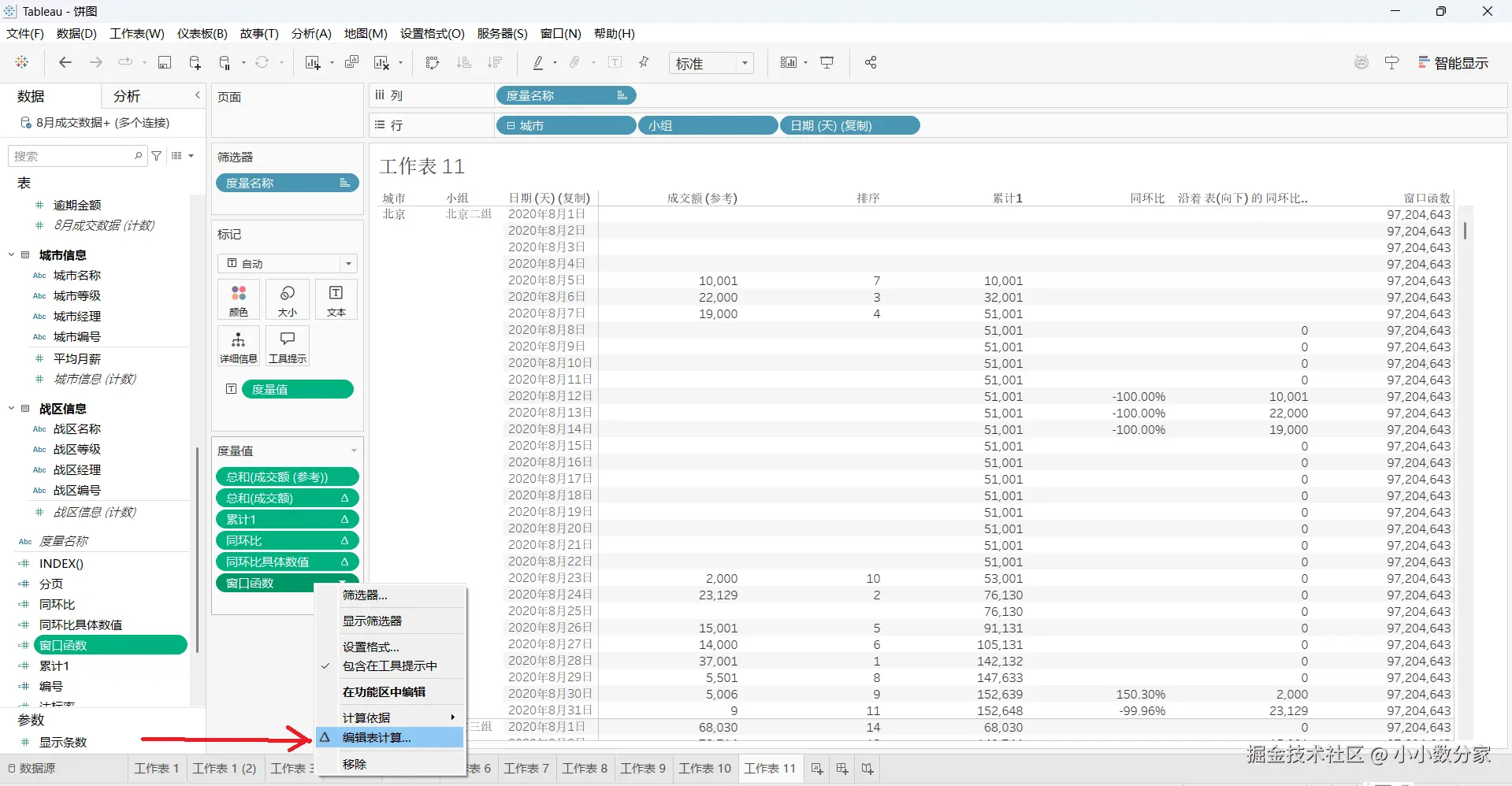 创建计算字段,命名为小组当天的成交额占整个城市成交额的占比,移动到度量值,点击快速表计算-->合计百分比