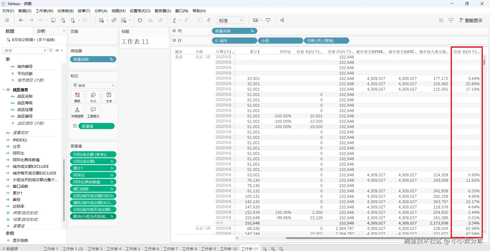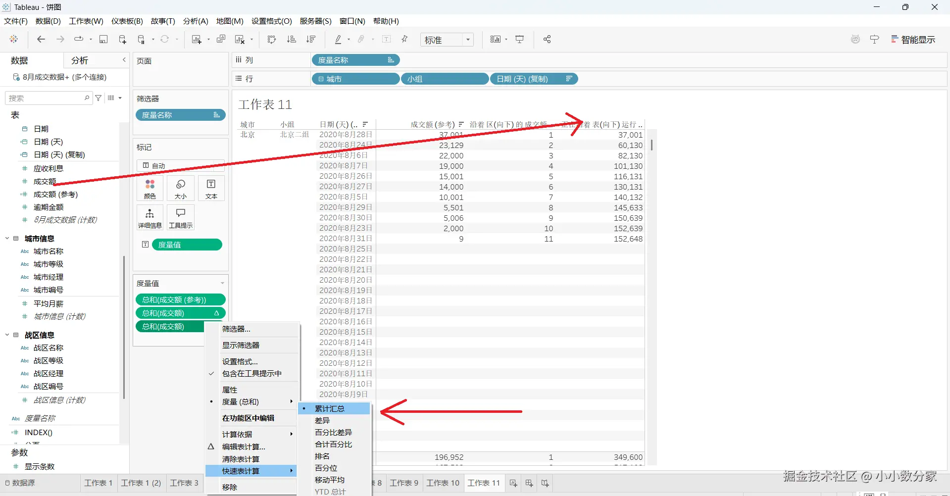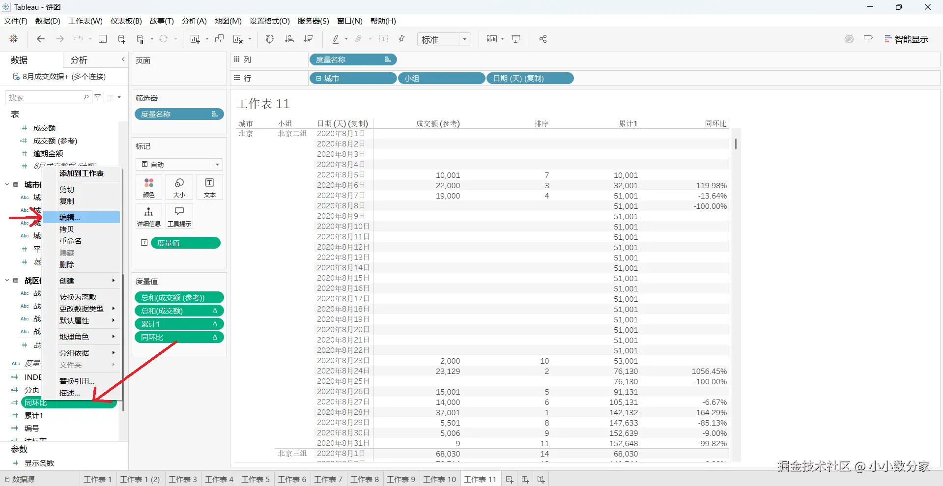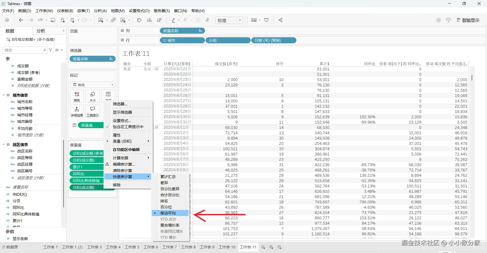 创建计算字段,命名为小组当天的成交额占整个城市成交额的占比,移动到度量值,点击快速表计算-->合计百分比