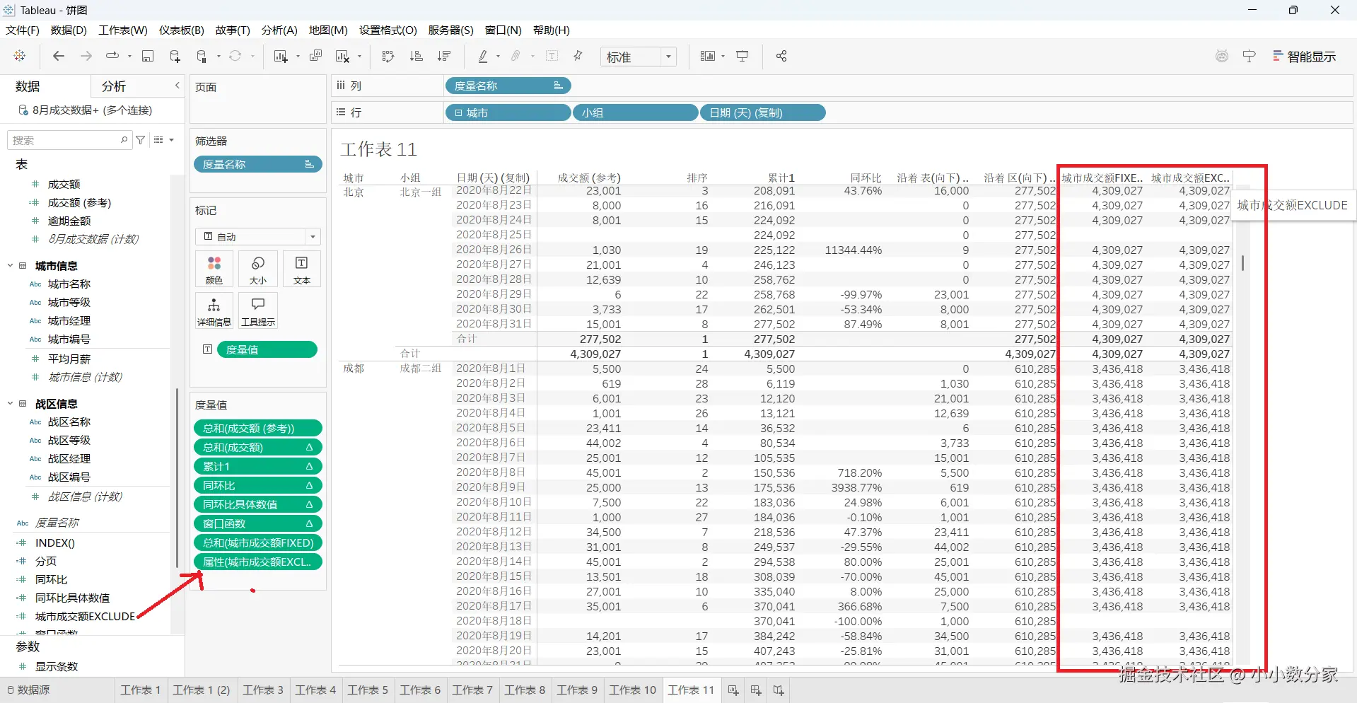 FIXED锁定城市进行运算和EXCLUDE忽略小组和日期进行剩余的维度进行计算,它们之间的结果是一样的。
