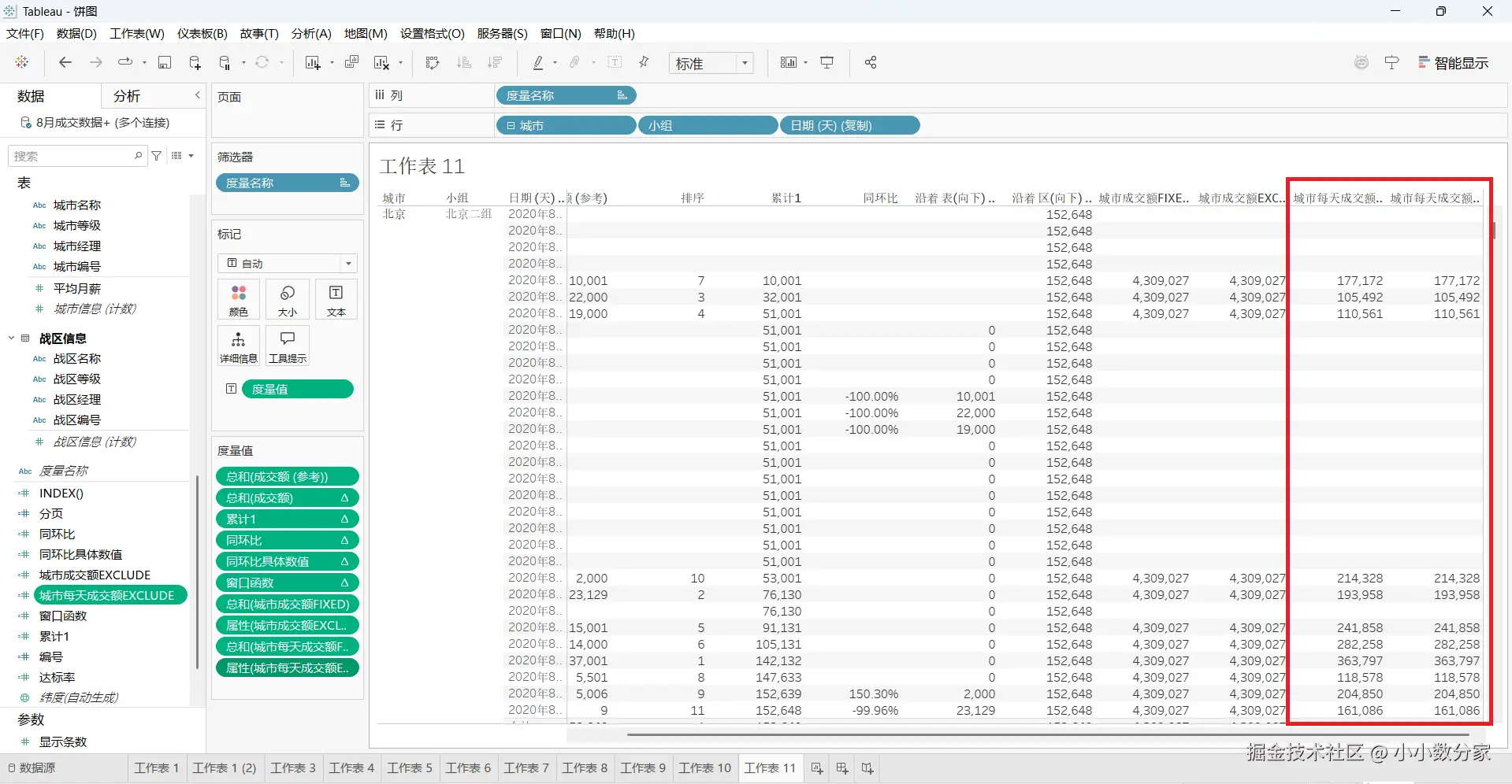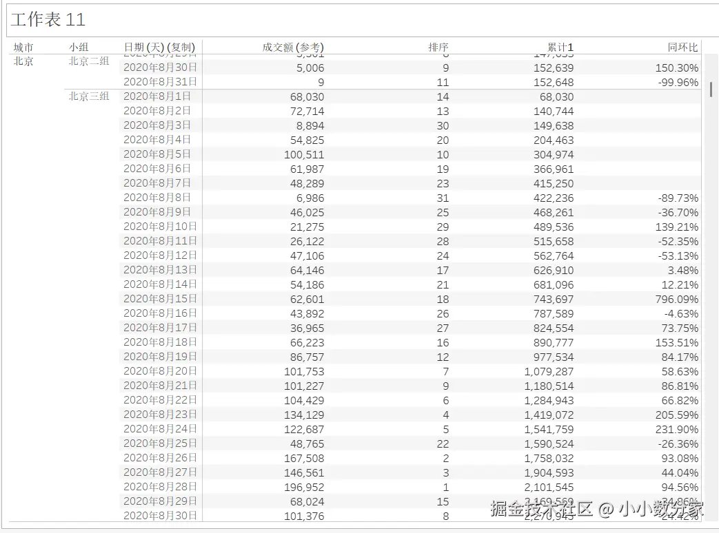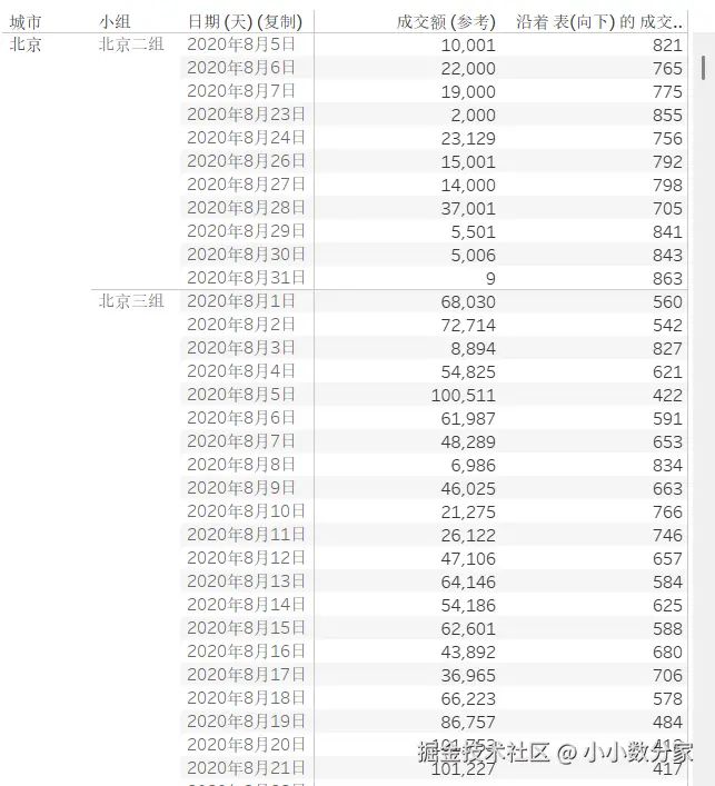 小组当天的成交额是有的,但是这个城市当天的成交额我们又该如何计算呢?理论上我们锁定城市、日期就OK了