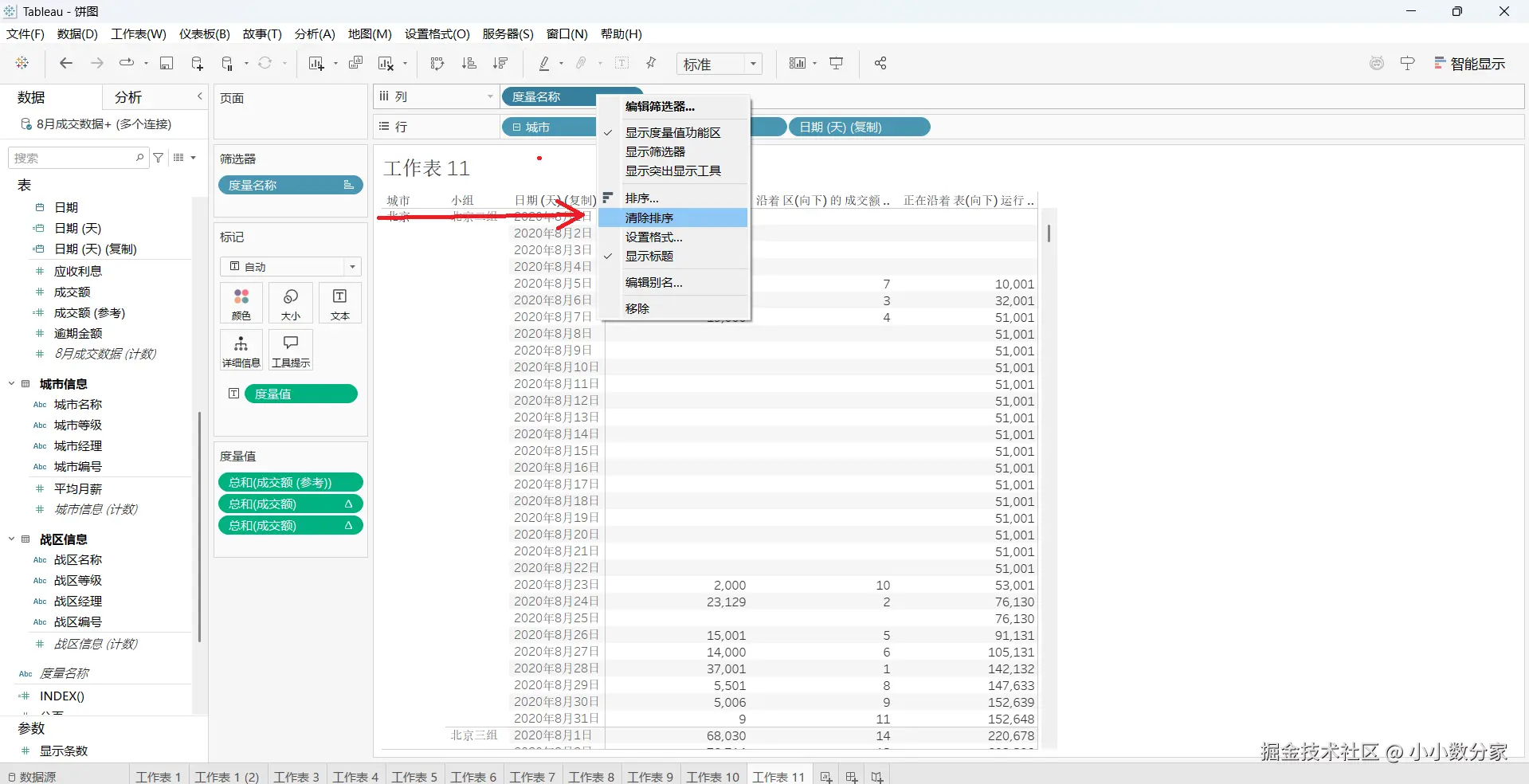 3.再拖一个成交额到文本上,快速表计算-->累计汇总。清除日期(天)(复制)、度量名称的排序,右键日期(天)(复制)、度量名称,点击清除排序。让它仅按日期进行排序