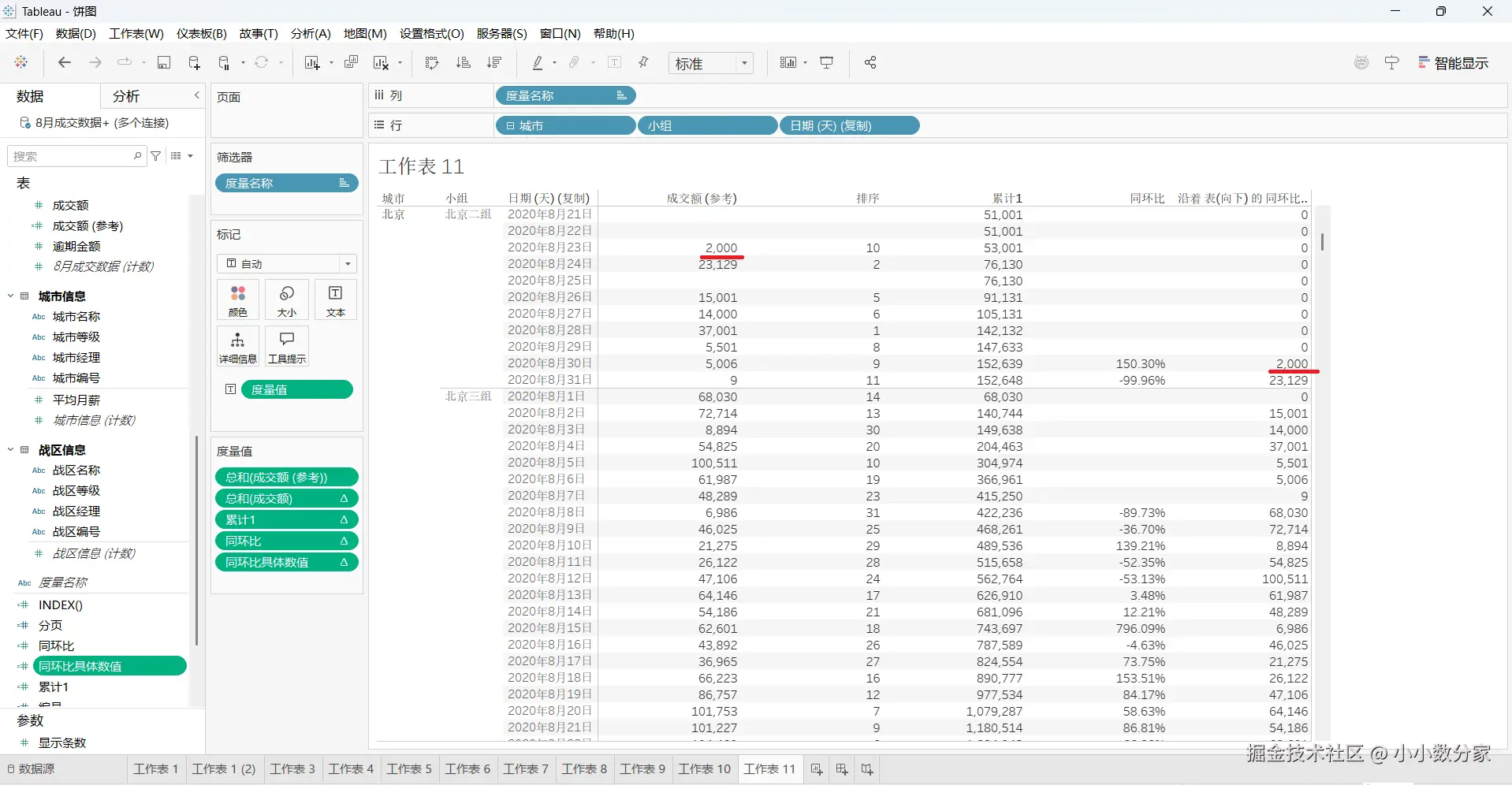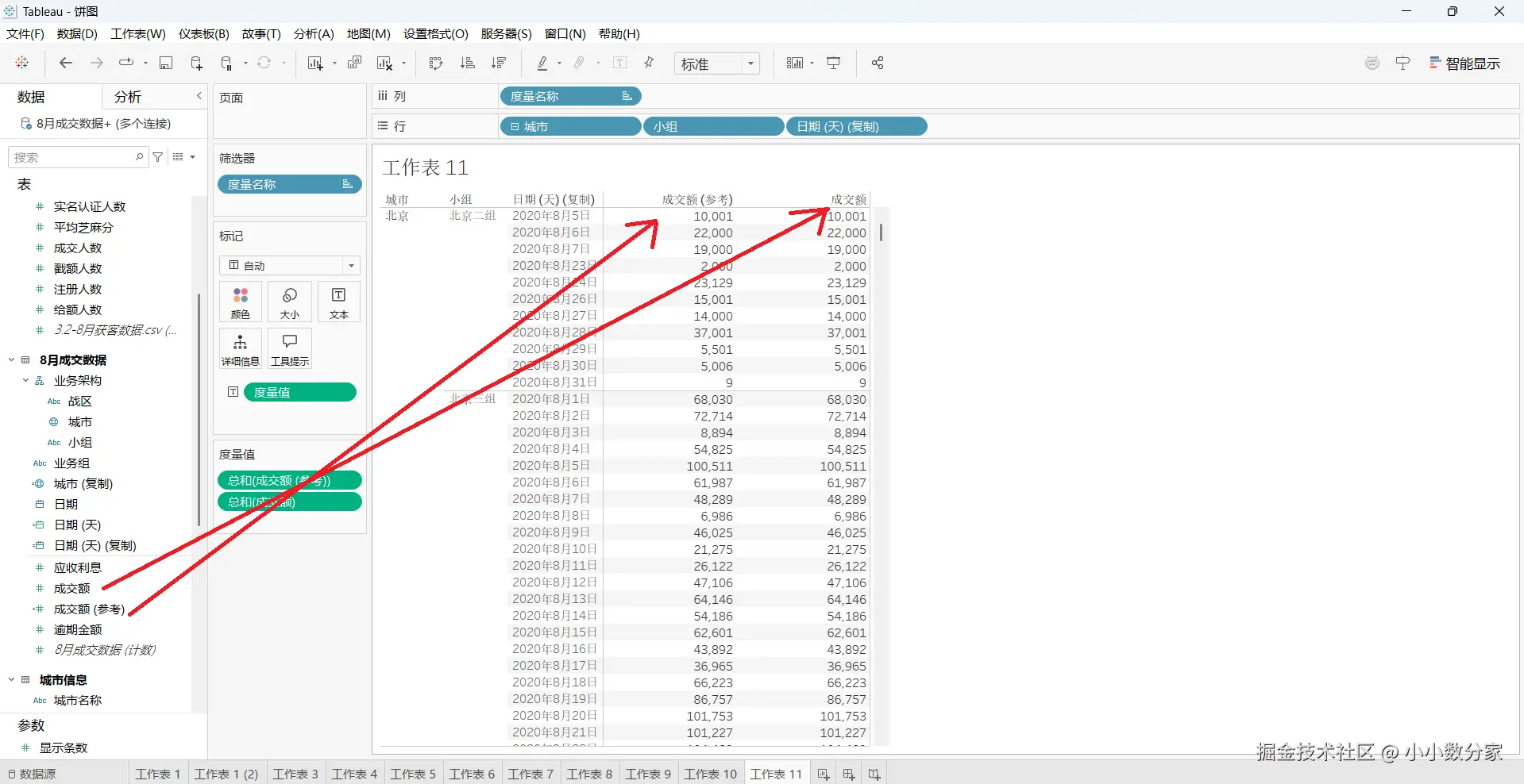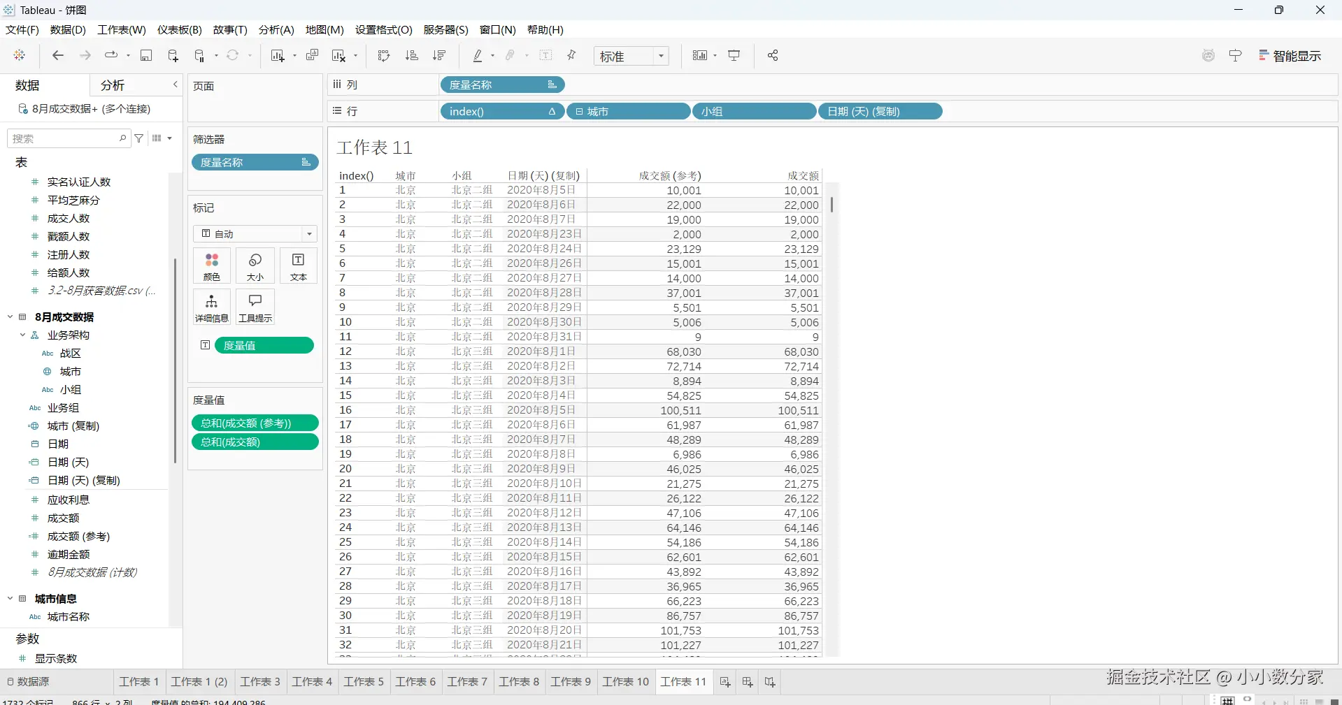 1.将城市、小组、日期(天)(复制)移动到行上(日期(天)(复制)详细见tableau实战工作场景图表制作第三期--折线图),并复制成交额,命名为成交额(参考),将成交额(参考)、成交额拖到文本上