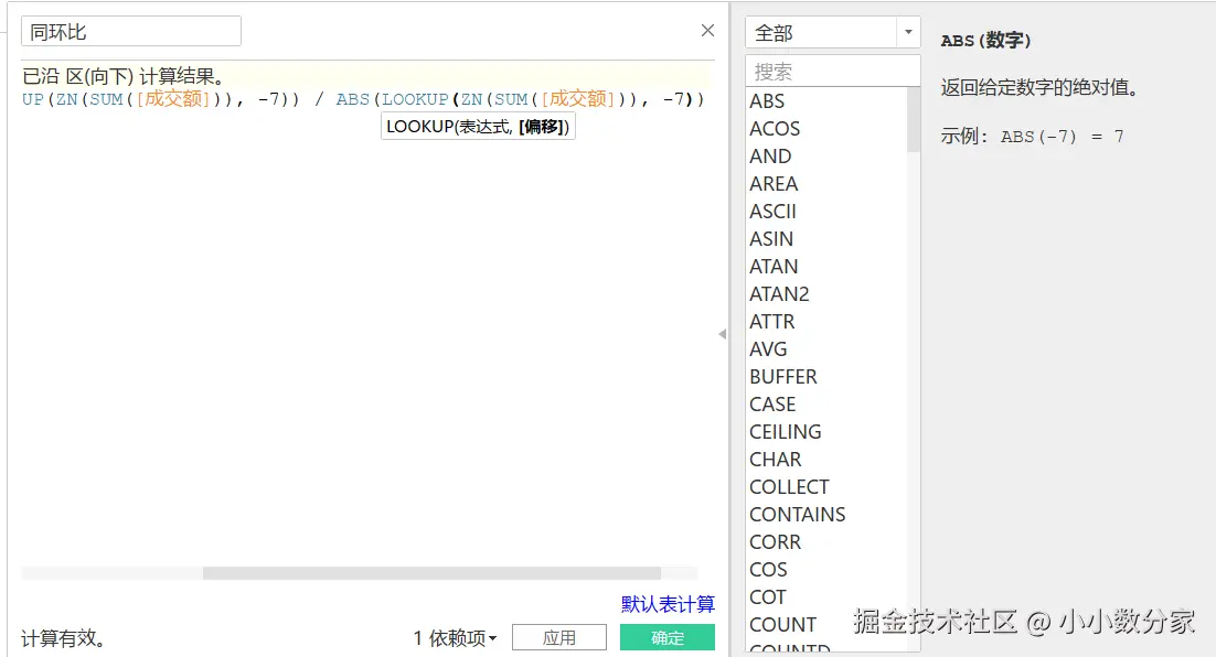 LOOKUP()函数可以理解为往前看几行。比如说我们要计算的是一个天环比,也就是把这一行本身的成交额-上一行的成交额,因此这里面就是做一个LOOKUP(ZN(SUM([成交额])), -1))的操作。