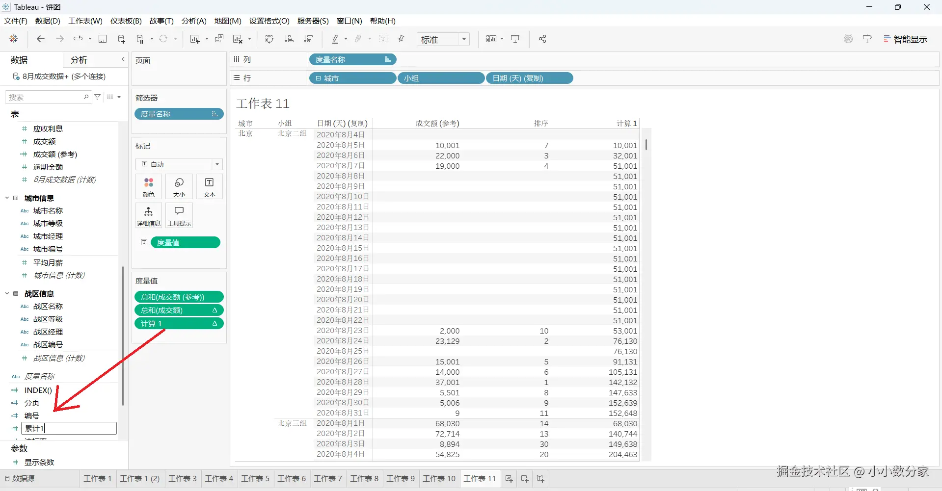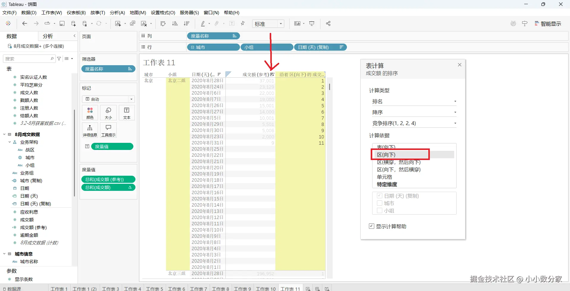 4.累计汇总如果是表向下,它就会每一个有数值的行都会进行累计的加总,比如8月6日累计汇总成交额32001就等于前面有数值两行8月5日成交额10001和8月6日成交额22000的累计汇总。右键累计汇总成交额的编辑表计算,改为区(向下)。就是每个小组它每天的累计是多少。这里面某些是没有成交额的,它会跳过。并编辑表别名,命名为累计。排名字段命名为排序。