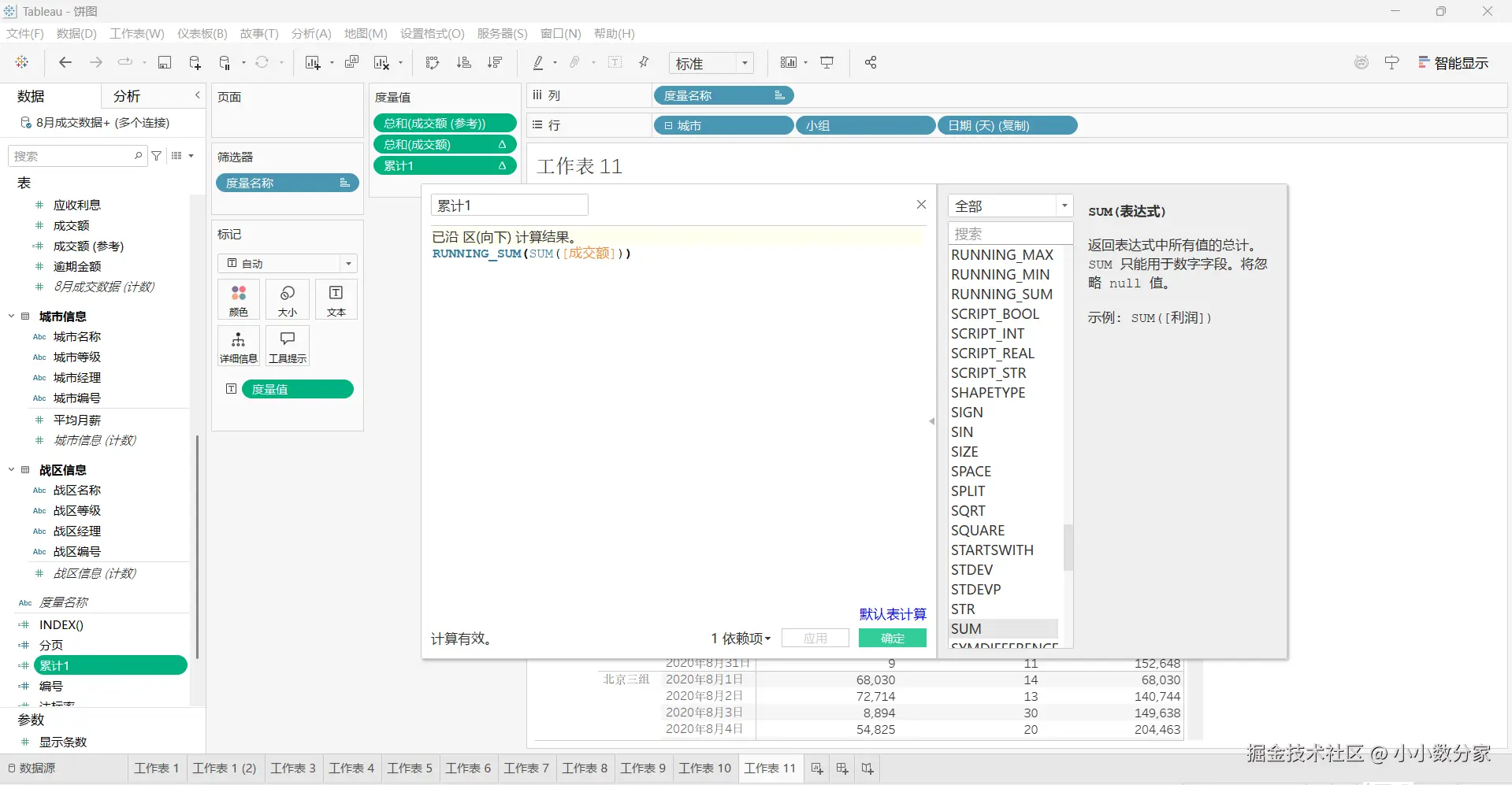 5.将累计汇总的成交额拖拽到左侧,命名为累计1。右键累计1,点击编辑进去查看函数。RUNNING_SUM()返回指定分区中从第一行到当前行的总计