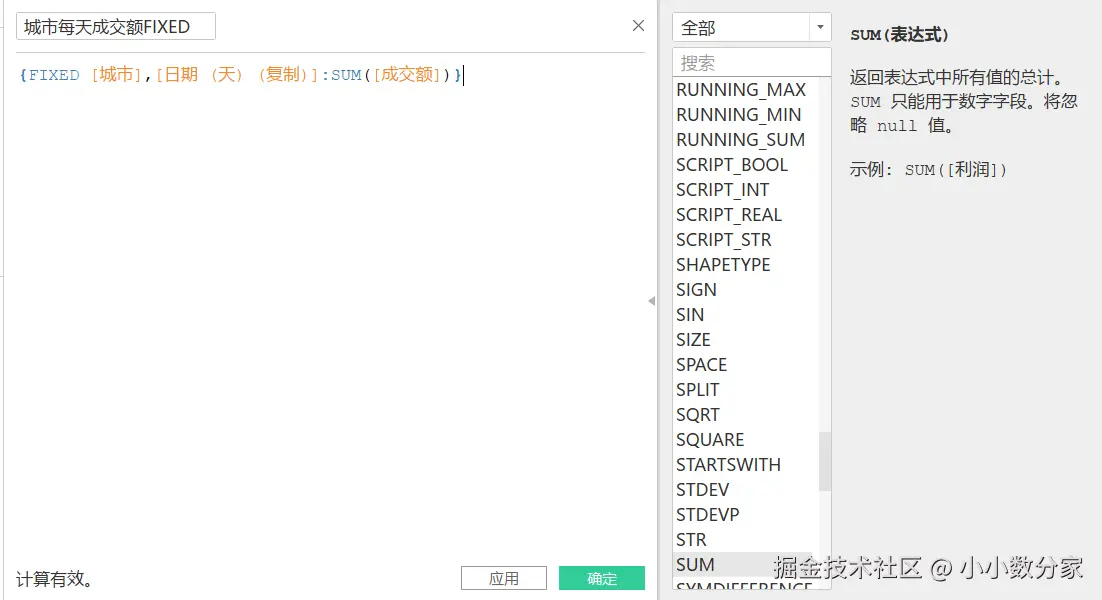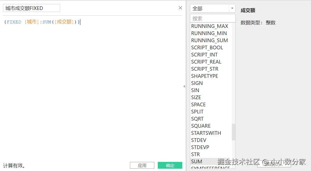 这里LOD表达式要用大括号去包裹,代表它是不同级别的运算,接着有个FIXED就是指锁定某一个级别,这里锁定到城市,然后后面聚合方式是SUM([成交额])