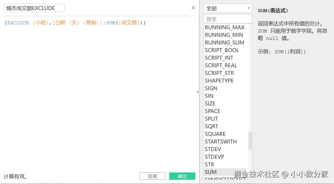 4.当然这里城市每天成交额还可以用EXCLUDE,创建计算字段,命名为城市每日成交额EXCLUDE,输入我们的LOD表达式,将做好的字段拖拽到度量。最后结果与FIXED表达式一致。