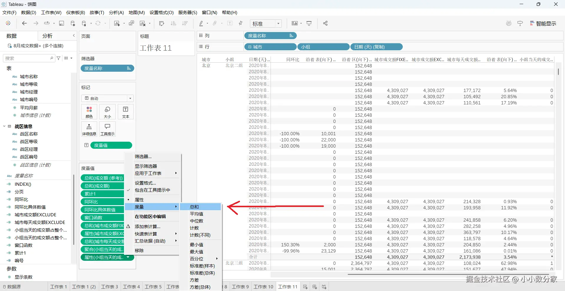 创建计算字段,命名为小组当天的成交额占整个城市成交额的占比1,移动到度量值,点击度量-->总和,右键小组当天的成交额占整个城市成交额的占比1,点击快速表计算-->合计百分比