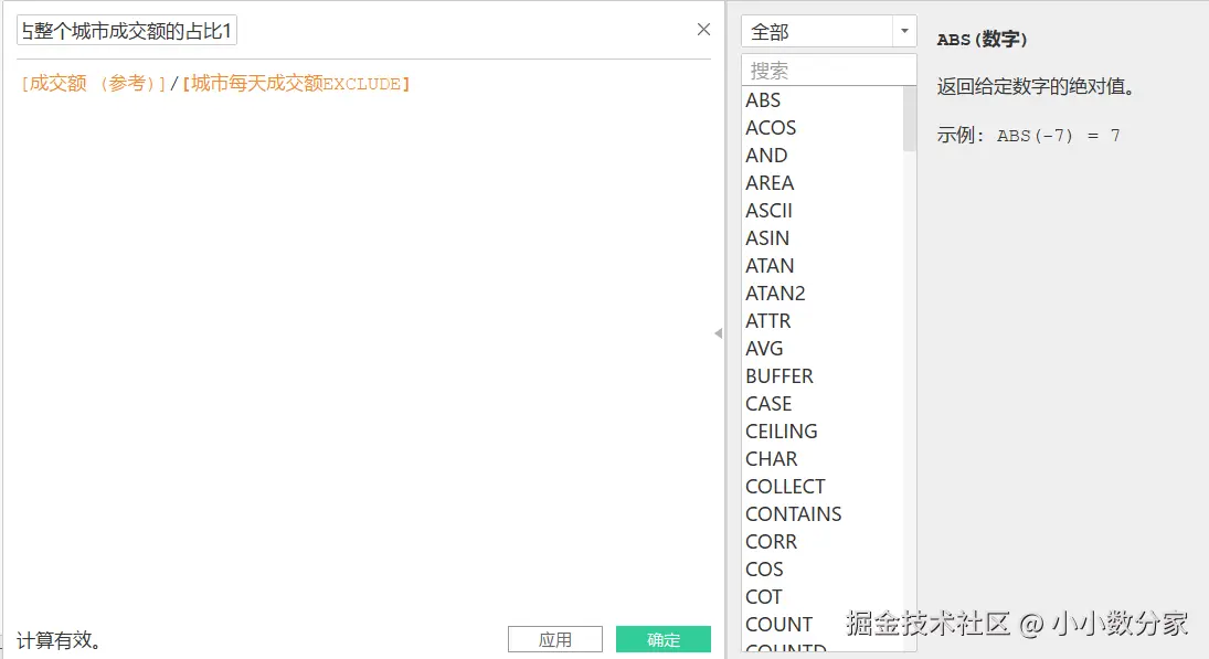 2.创建计算字段,命名为城市成交额EXCLUDE,输入我们的LOD表达式,将做好的字段拖拽到度量