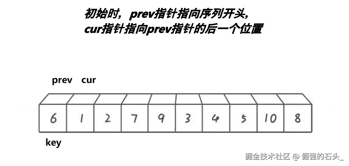 prev(前指针)初始化为left,它用于记录小于基准值的最后一个元素的位置。cur(后指针)初始化为left + 1,它用于遍历数组中的元素,寻找小于基准值的元素。