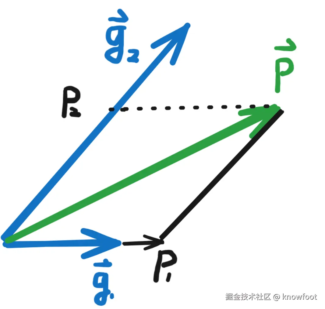 ,根据前面笛卡尔内积表达我们让向量P内积一个基矢 因为基矢不垂直所以 那 在这个倾斜的坐标系中笛卡尔那个内积表达分量就不能用了。为了能统一结构,数学家构建出另一组基矢量,叫逆变基矢 和我们前面那个基矢就被称为协变基矢,逆变基和协变基对比就是下标上移,构造的时候要让逆基矢和原来的基矢内积满足 关系。就是不同标的协变和逆变是要垂直即内积为0,例如 。同标内积为1,例如g1的协变基矢和g1逆变基矢内积等于1即 g1逆的模等于 如下图所示:
