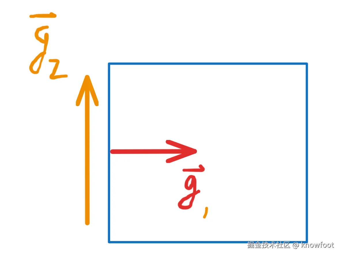 比如我们把一个二维方块放到水流中,水流不仅会推它,还会通过边界给予一个摩檫力,无论有多少力都是通过边界传递的。小方块的受力总和是它所有边界受力总和。这样我们就可以脱离方块本身只用研究边界受力情况就可以,对于一个边界我们可以用一个垂直于这个边界的矢量,称为面矢量(二维中是线矢量,这里面矢量沿用的三维空间的描述),用这个矢量的单位矢量 作为一个基矢,如果我们把这个边界放到水流中,受到两个力,一个就是方向的力,另一个就是垂直于方向我们定义为方向的力,这个二维方块任何一个边界放到水流中这个位置都会受到一个面矢量方向的力,一个垂直于面矢量方向的力,如图:
