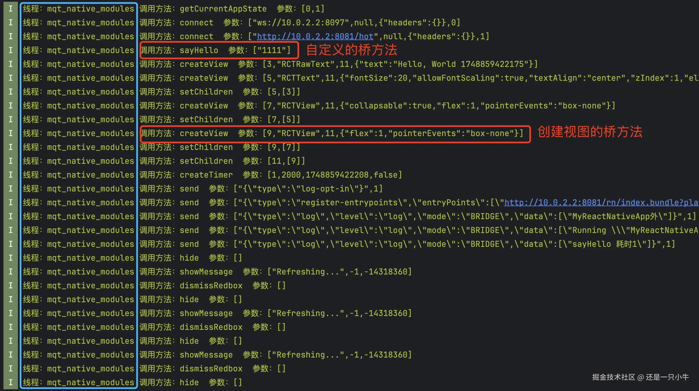 android.util.Log.i("RN测试", "线程:" + Thread.currentThread().getName() + " 调用方法:" + ((JavaMethodWrapper)mMethods.get(methodId)).getMethod().getName() + " 参数:" + parameters);