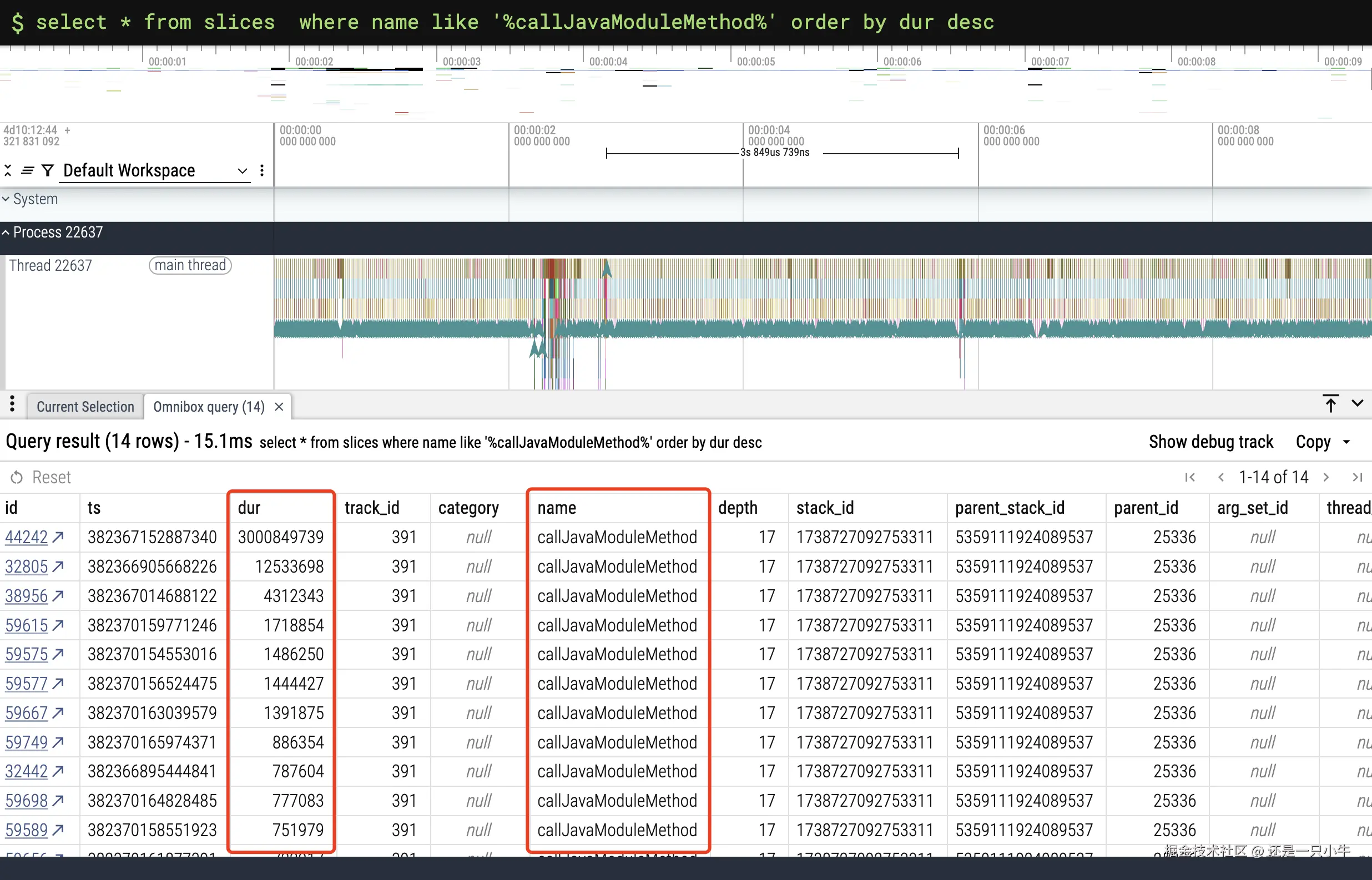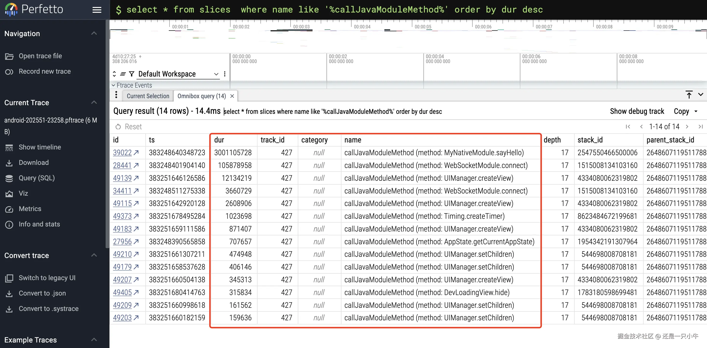 Perfetto支持通过SQL查询Trace,可以查桥执行耗时、桥调用顺序等。