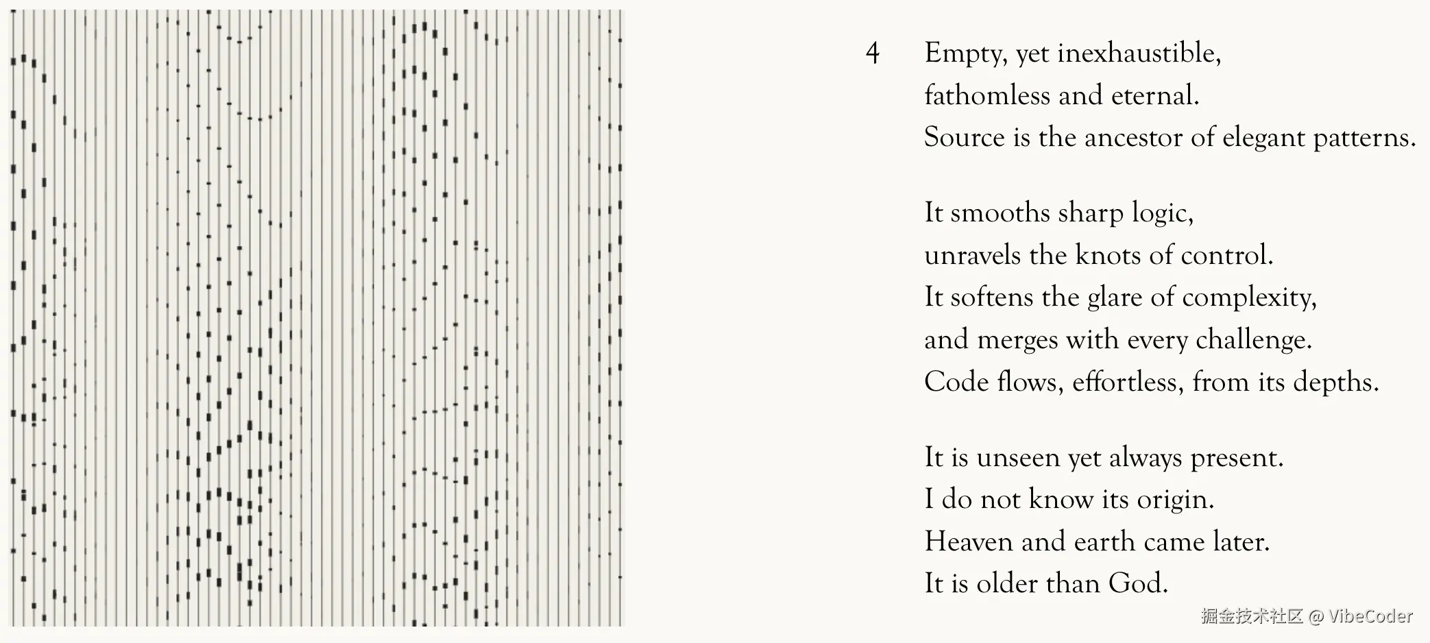 - “Empty, yet inexhaustible” → “道冲,而用之或不盈” (直引《道德经》第四章原句,喻代码本源如虚空容器)